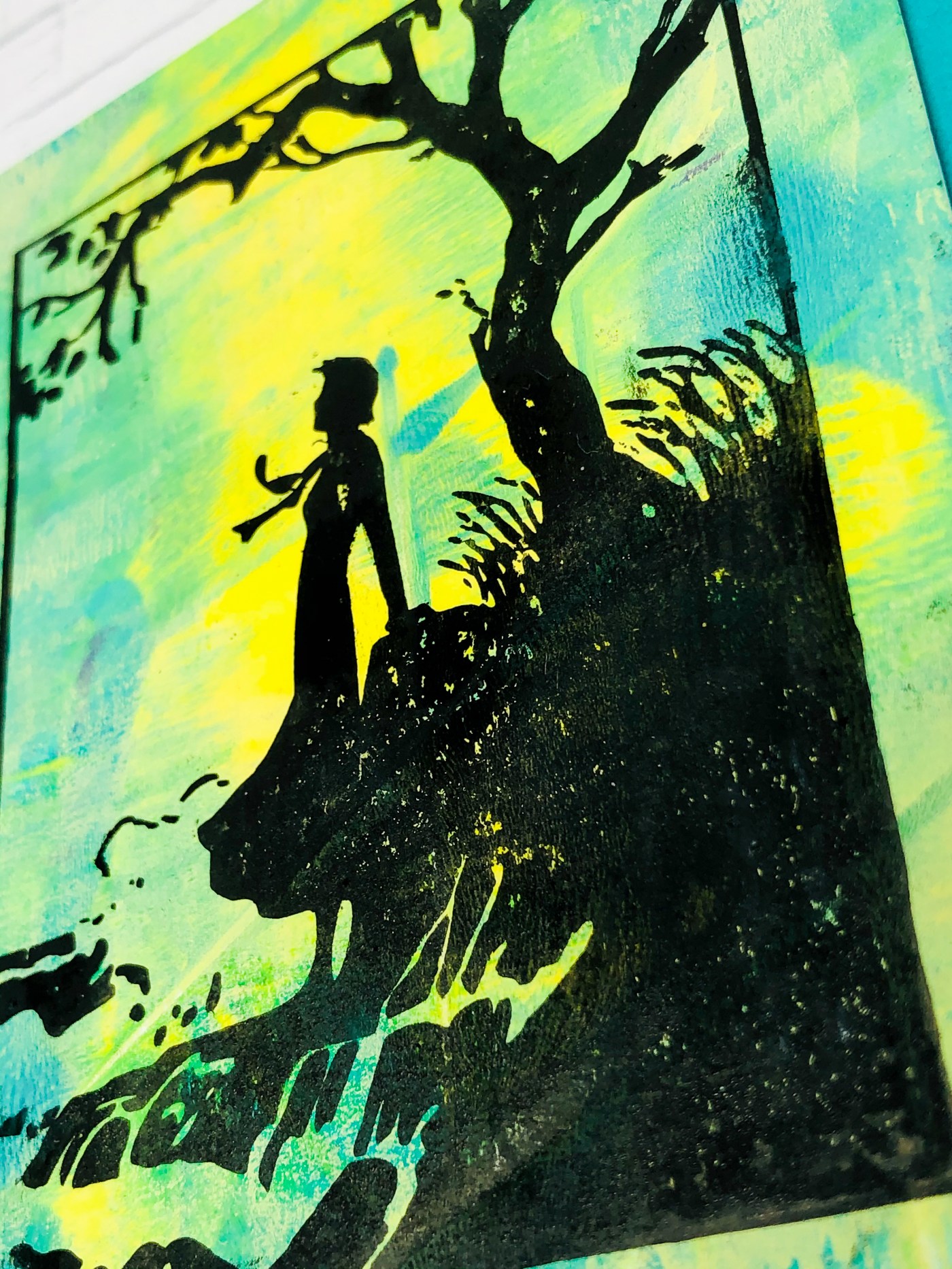 Ā I stamped the image in my MISTI with Versafine ink several times to ensure good coverage. I then found a aqua cardbase and attached the panel to it.