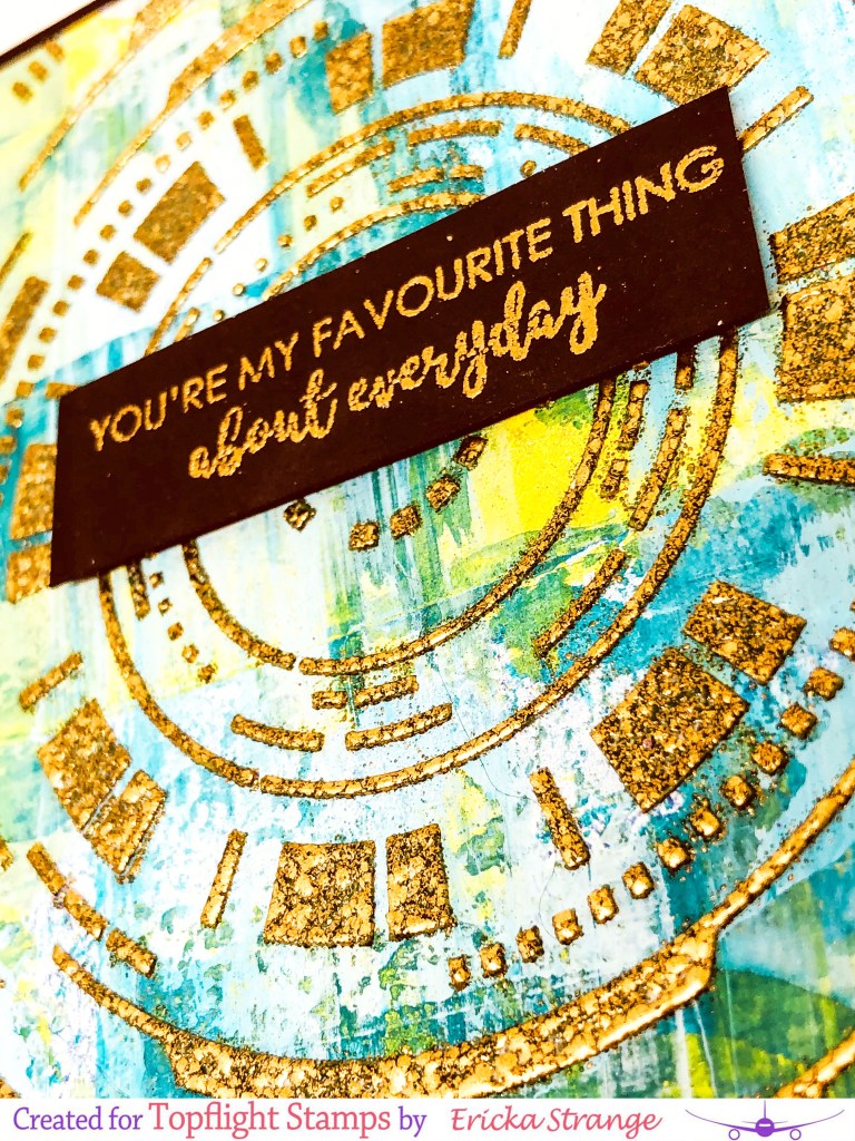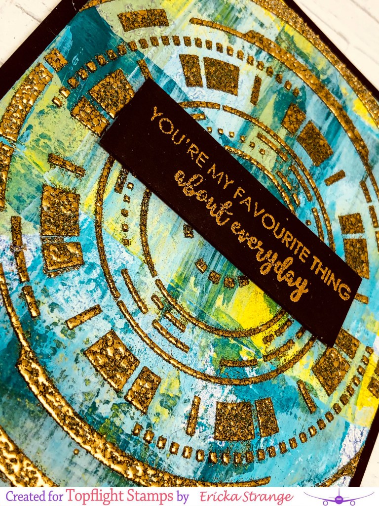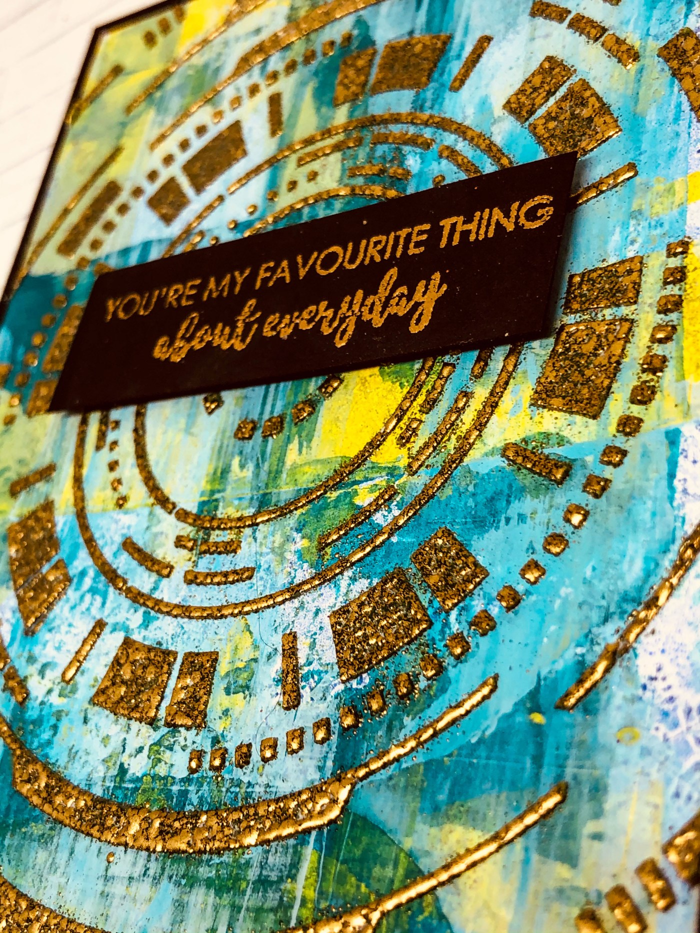I then applied textured paste through the Hud Stencil and then sprinkled WOW! Embossing embossed in Egyptian Turquoise. I let the paste dry over night and then heated the embossing powder to melt it.