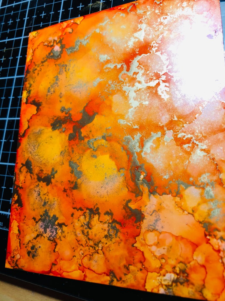 I love the great detail of this stamp and decided to pair it with an alcohol ink background. I started with Yupo paper and then used a blending tool with a felt applicator. I started with two yellows and two oranges in Dandelion, Sunshine Yellow, Ember, and Valencia. I then added some Gilded Alloy to the applicator and moved it around the Yupo for some gold shine.