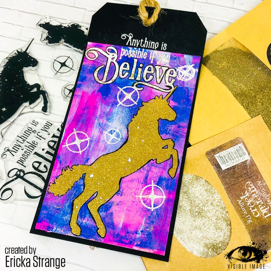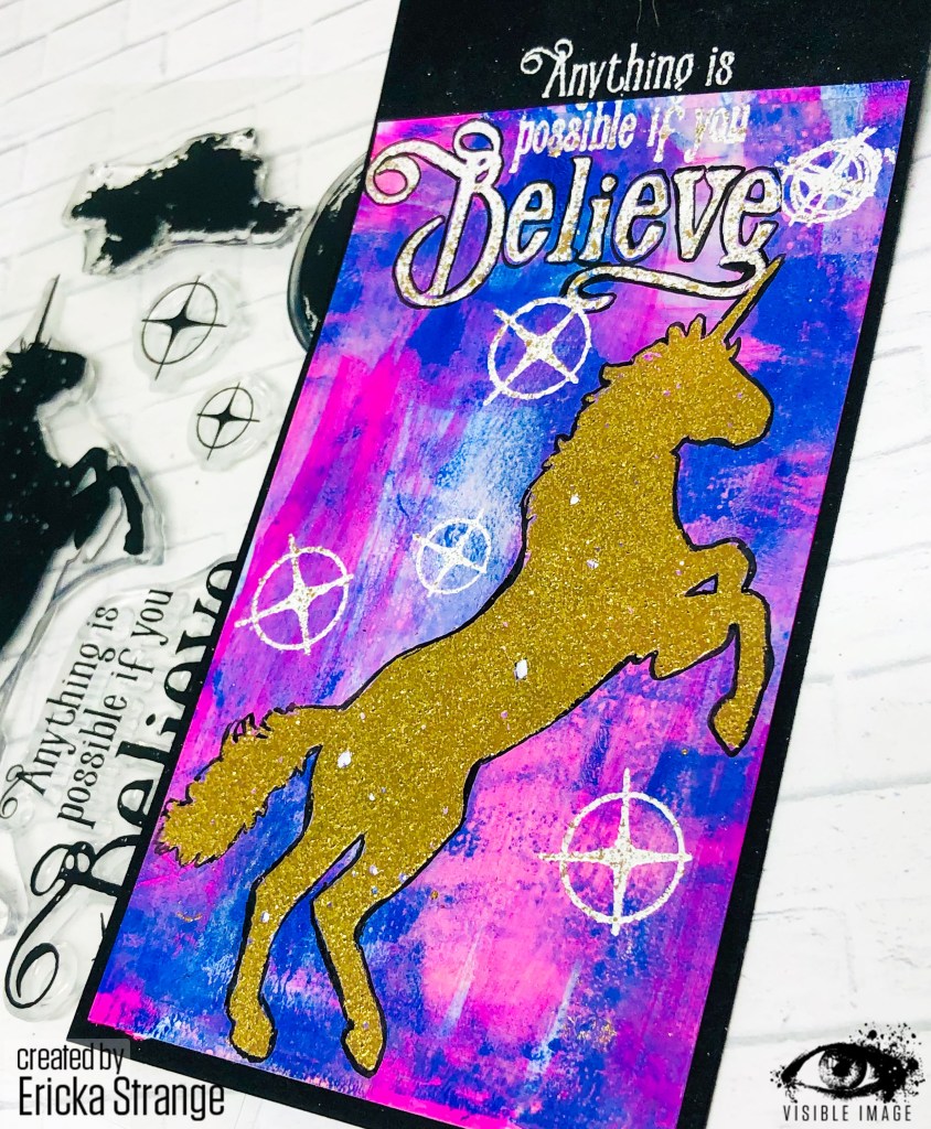 I love this image as well as the great sentiment. I had the perfect background I had previously made using acrylic paints and a brayer and started by taking the unicorn image and stamping it with WOW! Embossing ink. I used the Emerald Creek Gold Sparkle embossing powder for the unicorn because it is both gold and sparkly!