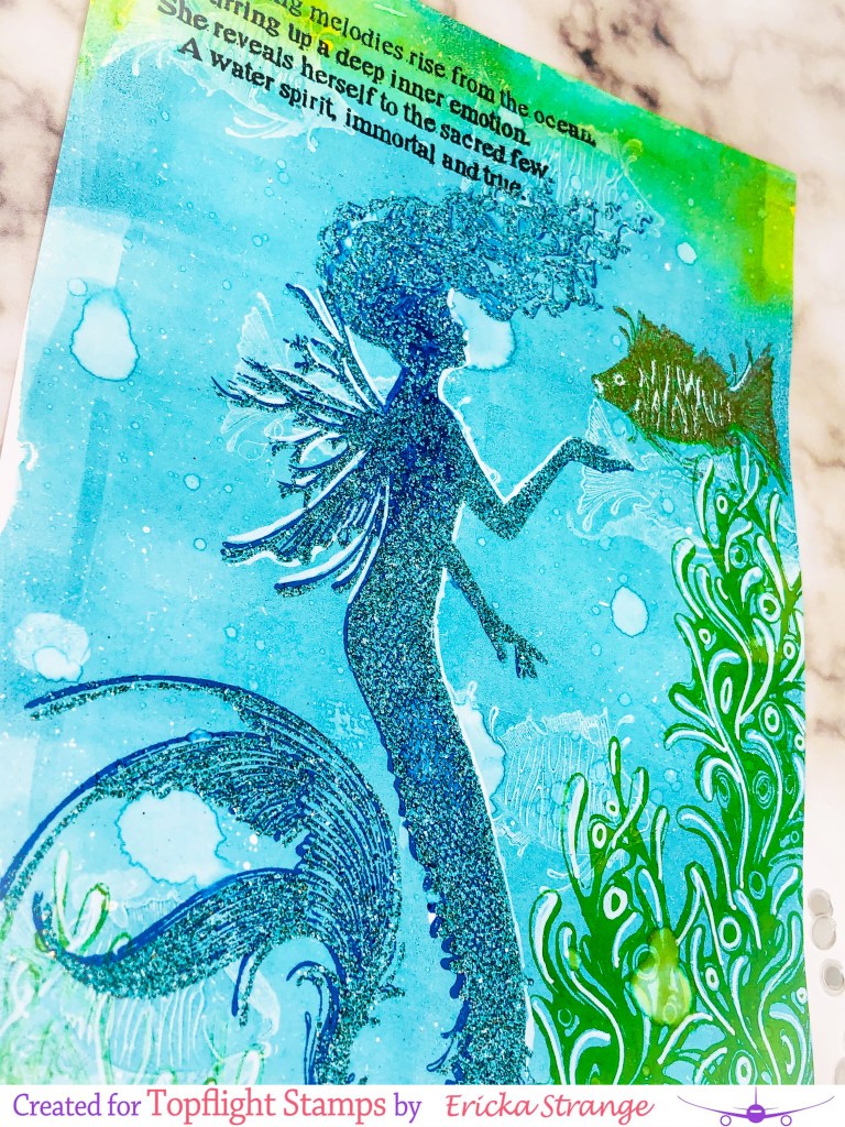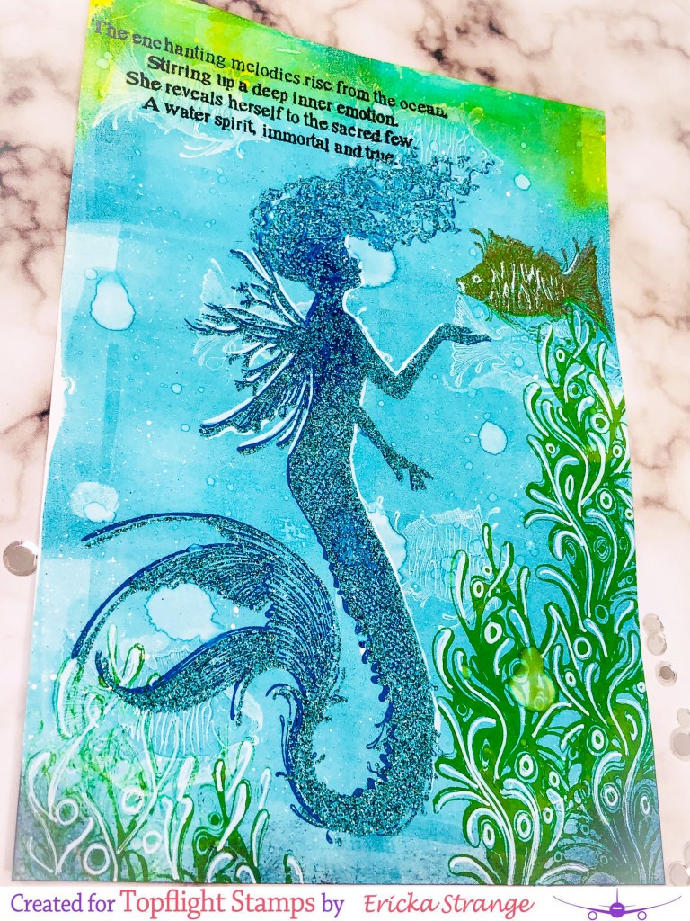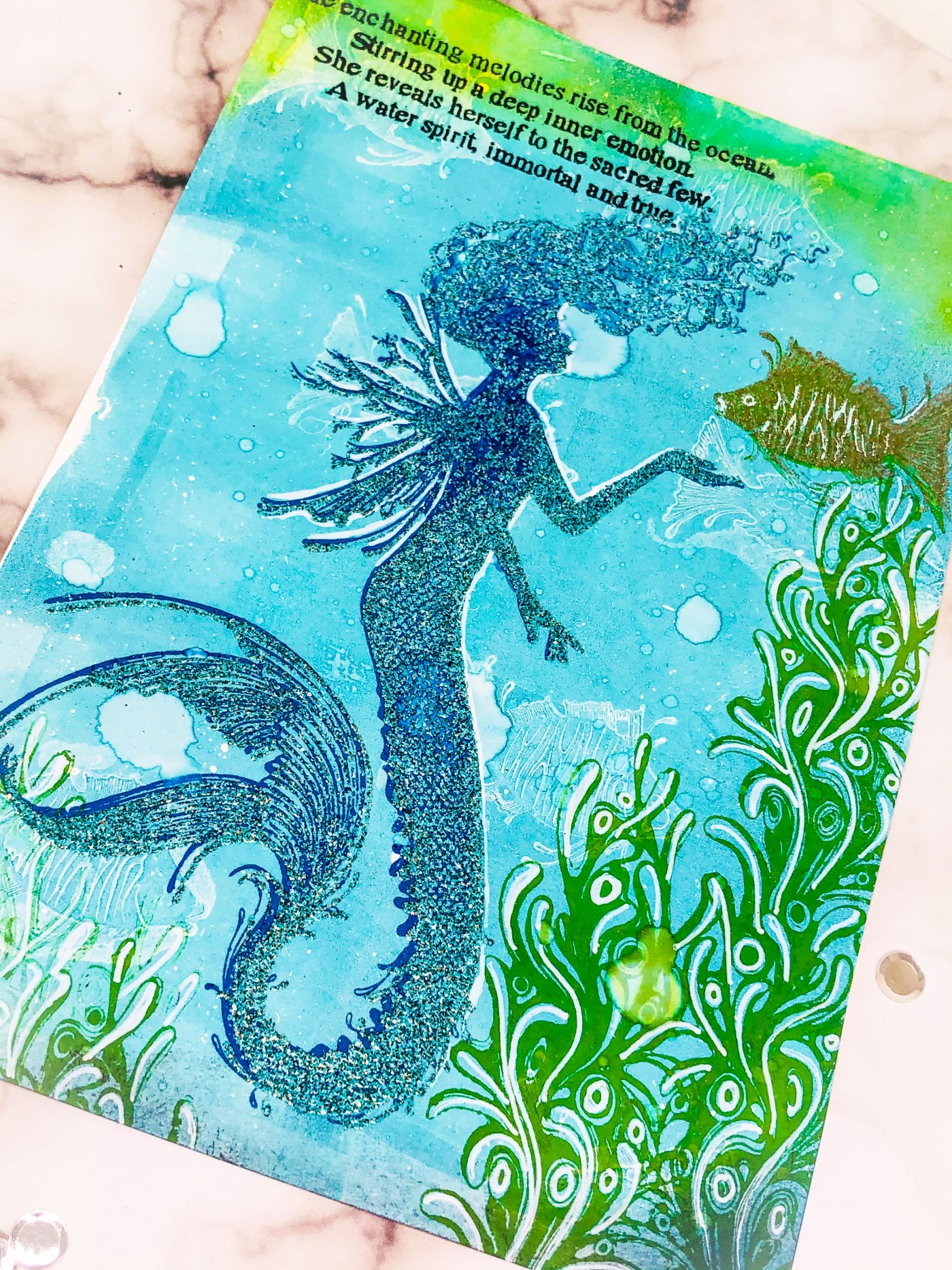 Next I stamped the Althea mermaid stamp in Blue Lagoon and then in WOW! Embossing Ink to heat emboss it in Sea of Tranquility part of the Trio Cosmic by Seth Apter. I used Pine ink to stamp the Sea Tangle around the bottom of my page and the Fish.Â