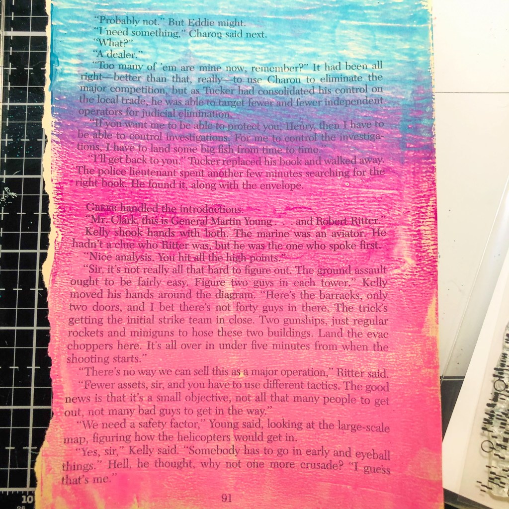 To start, I took a random page in my old book and used my gel press with the PaperArtsy Fresco Paints in Bubble Gum, Byzantium, and Aquamarine.