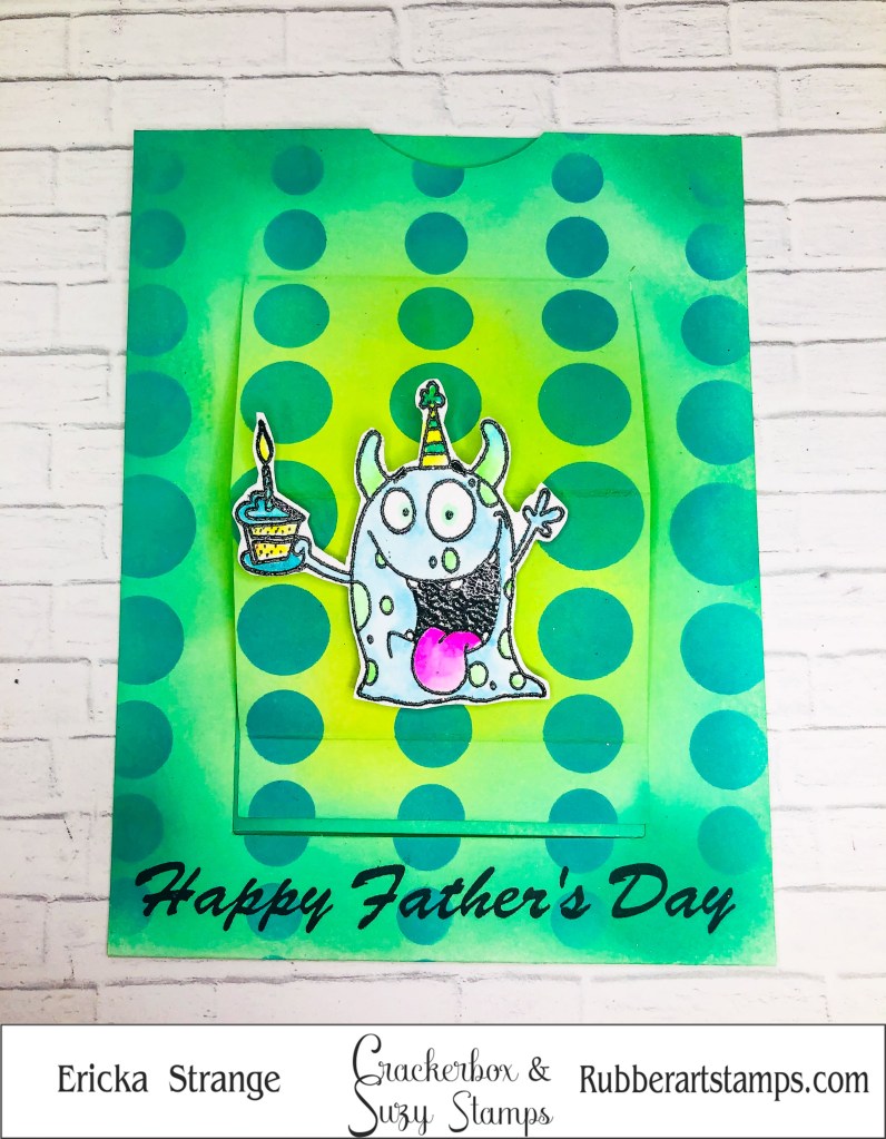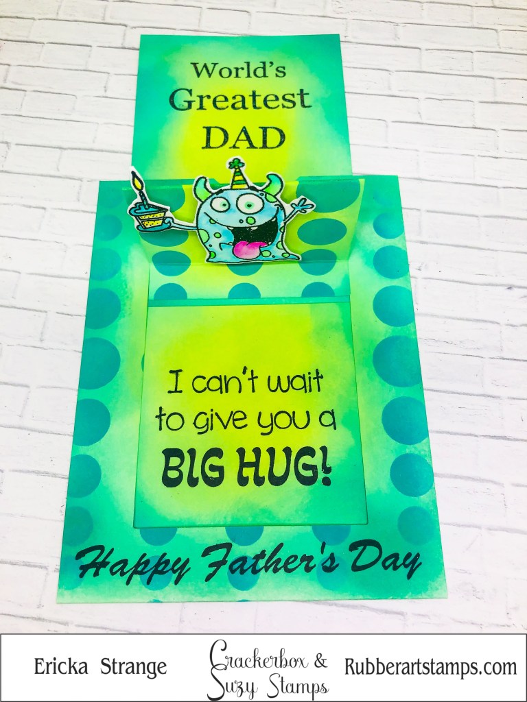 I stamped the Father’s Day Proud sentiment on the outside. I colored the little monster with watercolor markers and then fussy cut him out and adhered him to the slider section just below where it folds. I also used a portion of a circle punch on the top of the card to make pulling the slider a little easier.