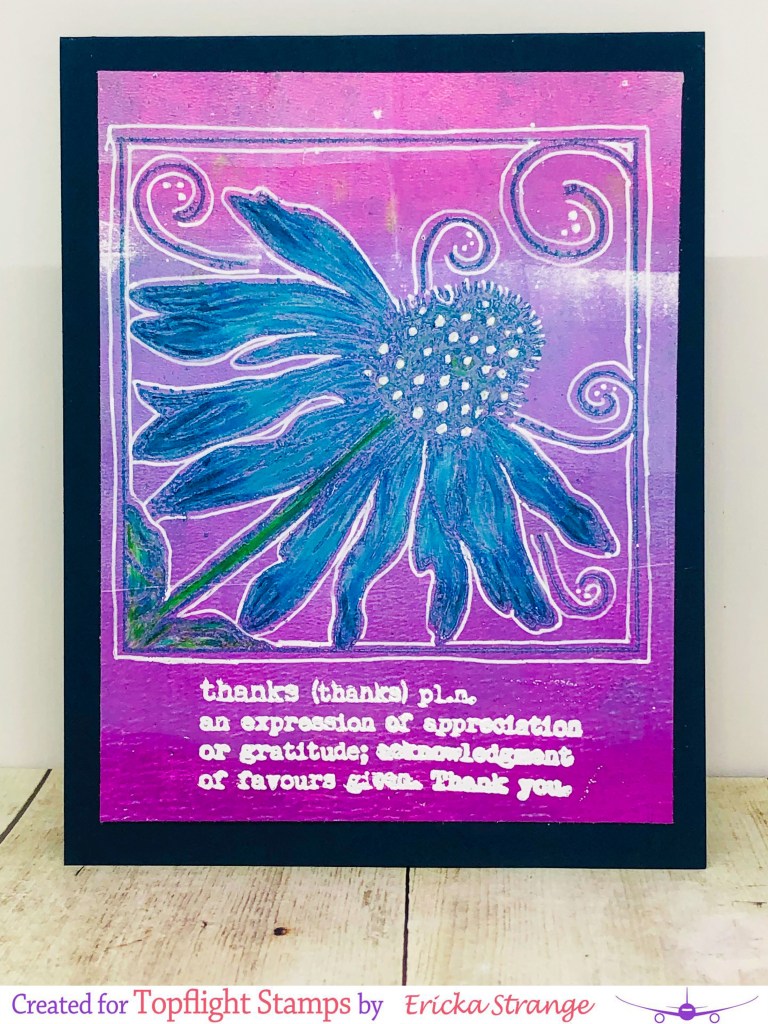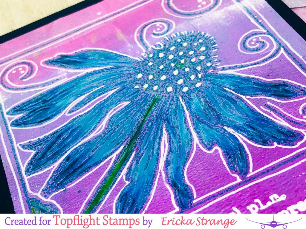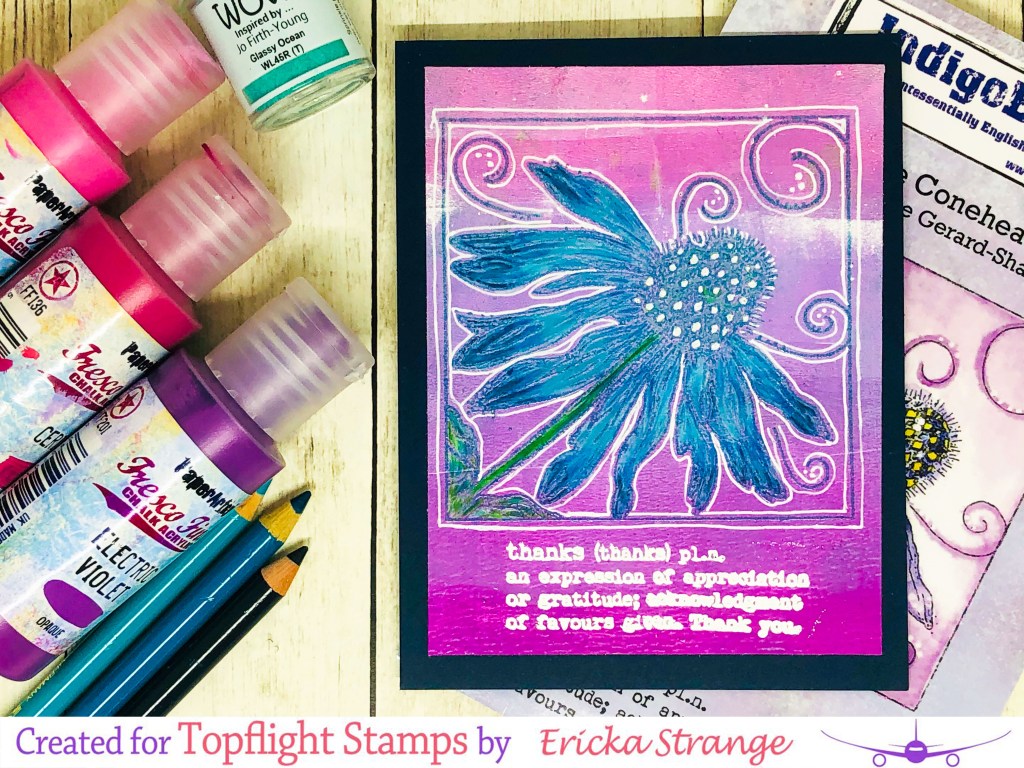 Hello everyone! I’m over on the Topflight Stamps blog with a card using the IndigoBlu Coulor Me Cone-head Daisy. I love this pretty stamp and decided to use it with a gel press background I made with PaperArtsy Fresco Paints in Bubble Gum, Cerise, and Electric Violet.