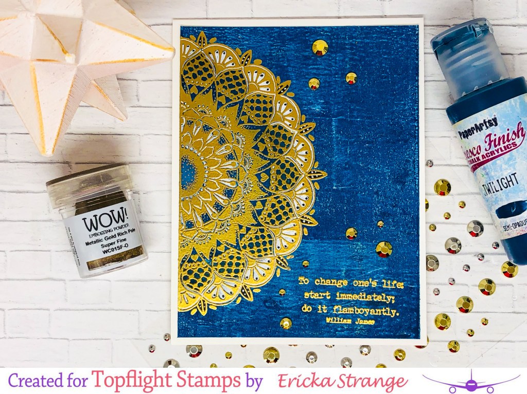 On my last card, I painted the background with Twilight Fresco Paint. Once it was dry I used WOW! Embossing Powder in gold to heat emboss the mandala.