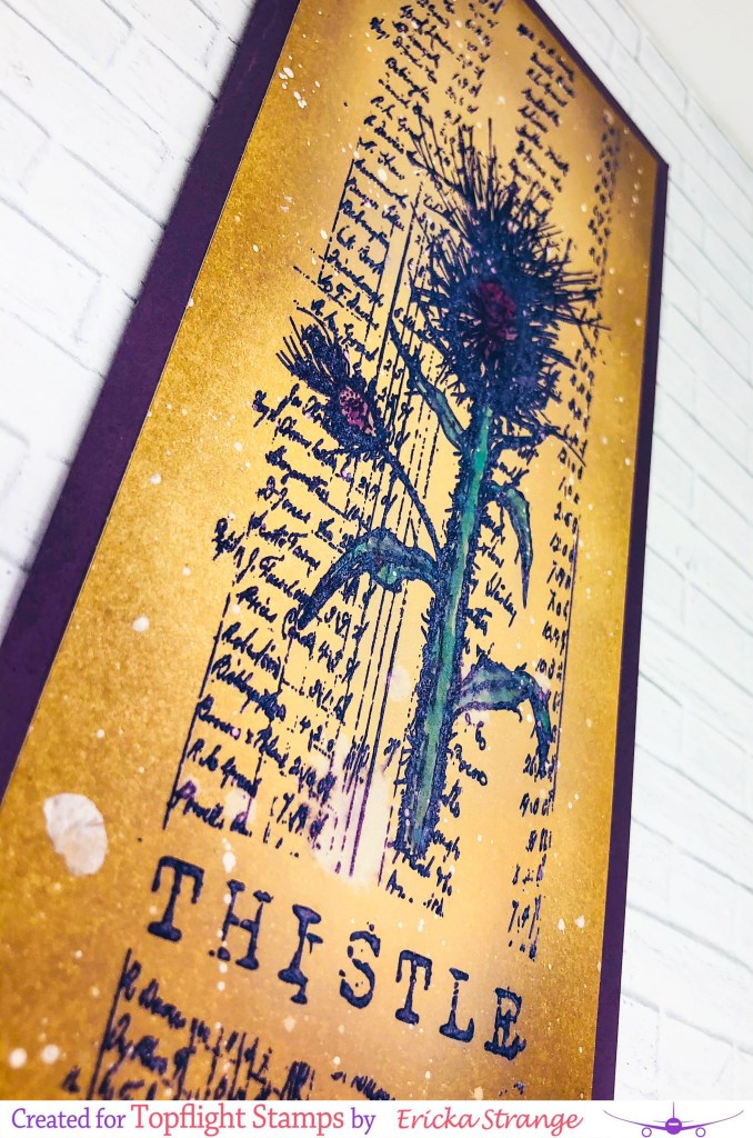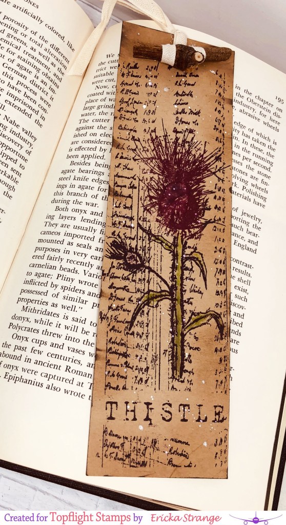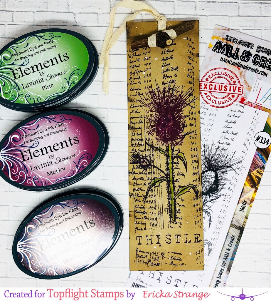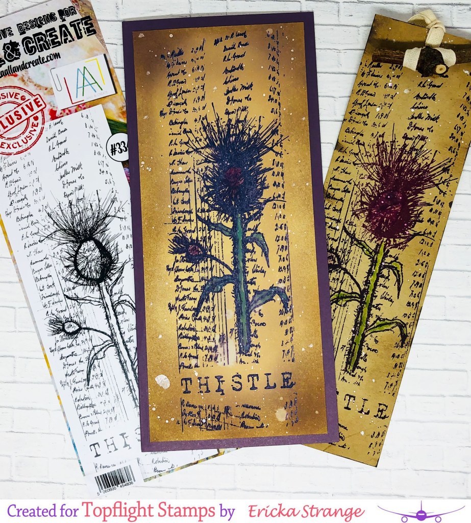 Hello friends! I’m over on the Topflight Stamps blog today playing with the AALL & Create Thistle stamp from Tracy Evans. I love this beautiful stamp and I’m always partial to images with script in the background. I love this set so much that I created a slimline card along with a bookmark.