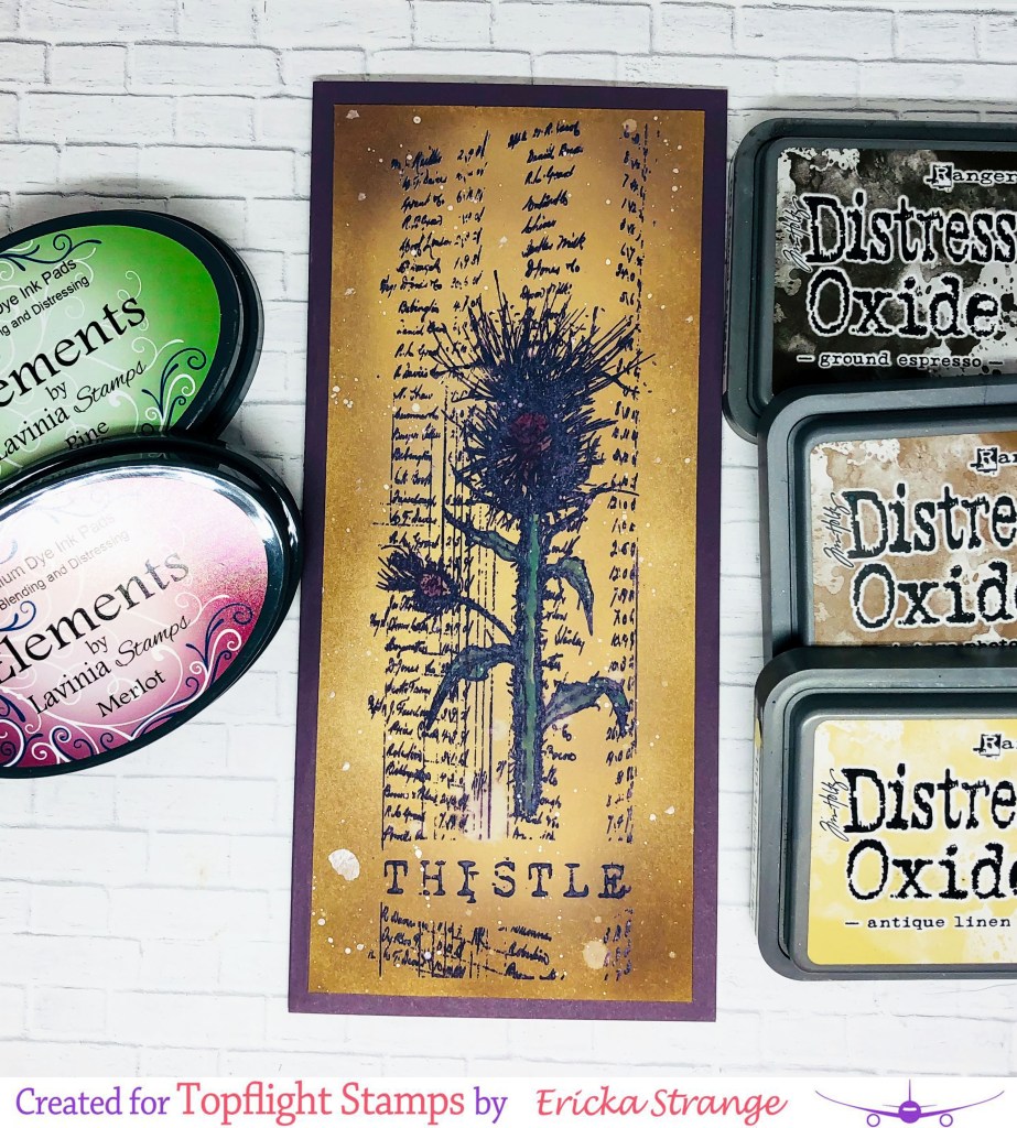 I used Distress Oxides and the Time for Tea blending brushes to blend the color onto my paper. I then stamped the thistle using Lavinia Elements Ink in Merlot and used the Pine ink to color in the stem.