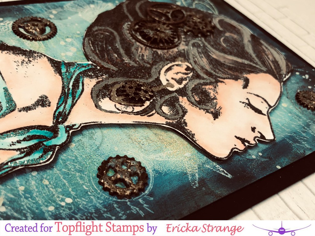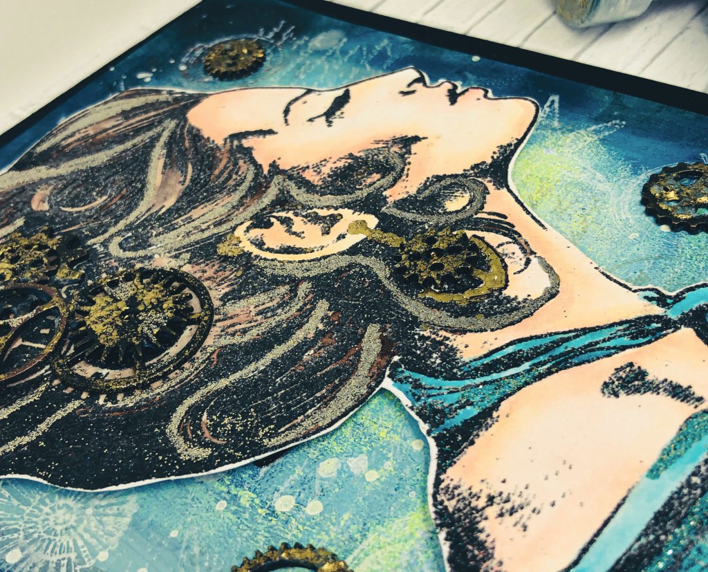 I used the stamps in the set with white ink around my background for added texture. I then used WOW! Mixed Media Brush and Egyptian Turquoise with some gears I had in my stash and heat embossed them to add to my plaque. I wanted a tad bit more shine on my lady so used the WOW! Embossing Pen with Sparkling Sand and Aquamarine to add highlights to her hair and clothes.
