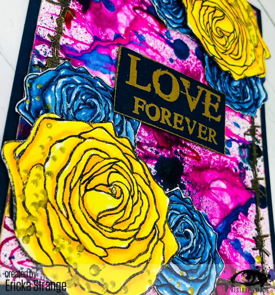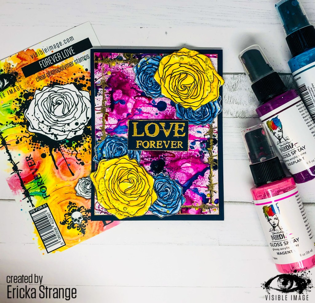 Happy Monday! I hope you are all doing well and having a great summer. Today I’m playing with the Visible Image Forever Love set and a background I made using Dina Wakley Media Spray. I love the vibrant colors of this spray and the unique look it gives to any background.