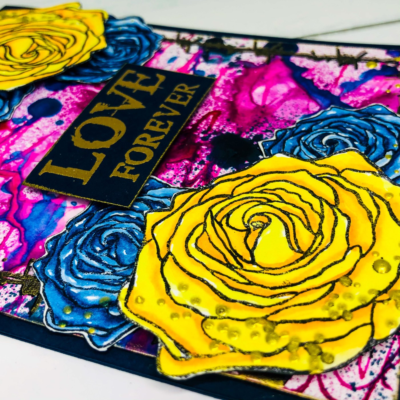I then used my Zig Clean Color Brushmarkers and colored up the roses in blues and yellows and cut them out to frame the corners of my card. I applied the flowers to my cad base with foam tape and then added some gold Nuvo drops on the flowers.