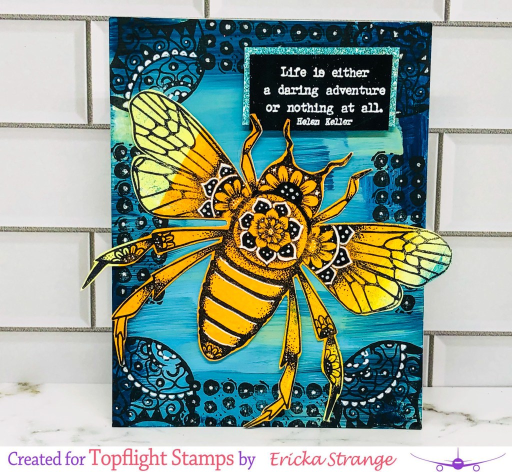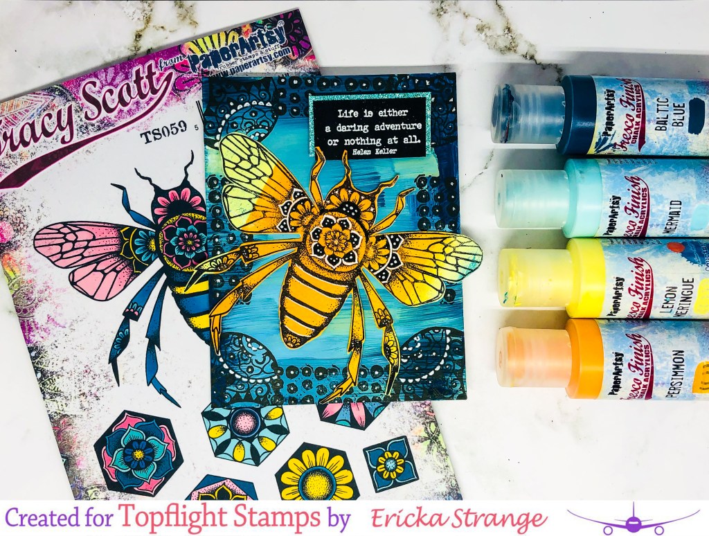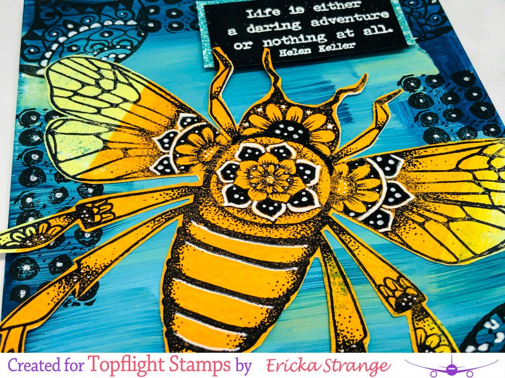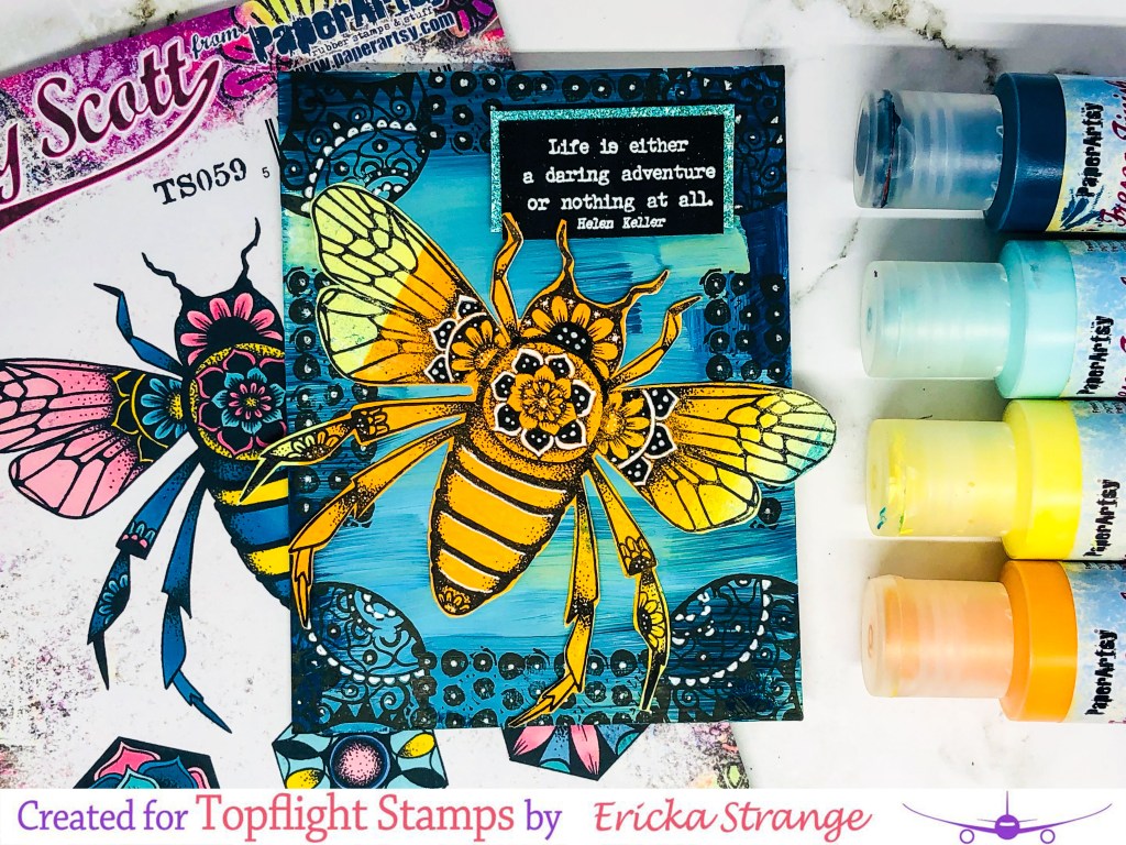 I created another gel press print using the PaperArtsy Fresco Chalk Paint in Persimmon and Lemon Meringue. I stamped the bee from the PaperArtsy Tracy Scott 59 set on my gel print. I love how large this beautiful bee is and all the gorgeous details. I used my white gel pen to highlight some of my favorite parts to help them pop. After fussy cutting my be, I attached it to my background with foam tape.