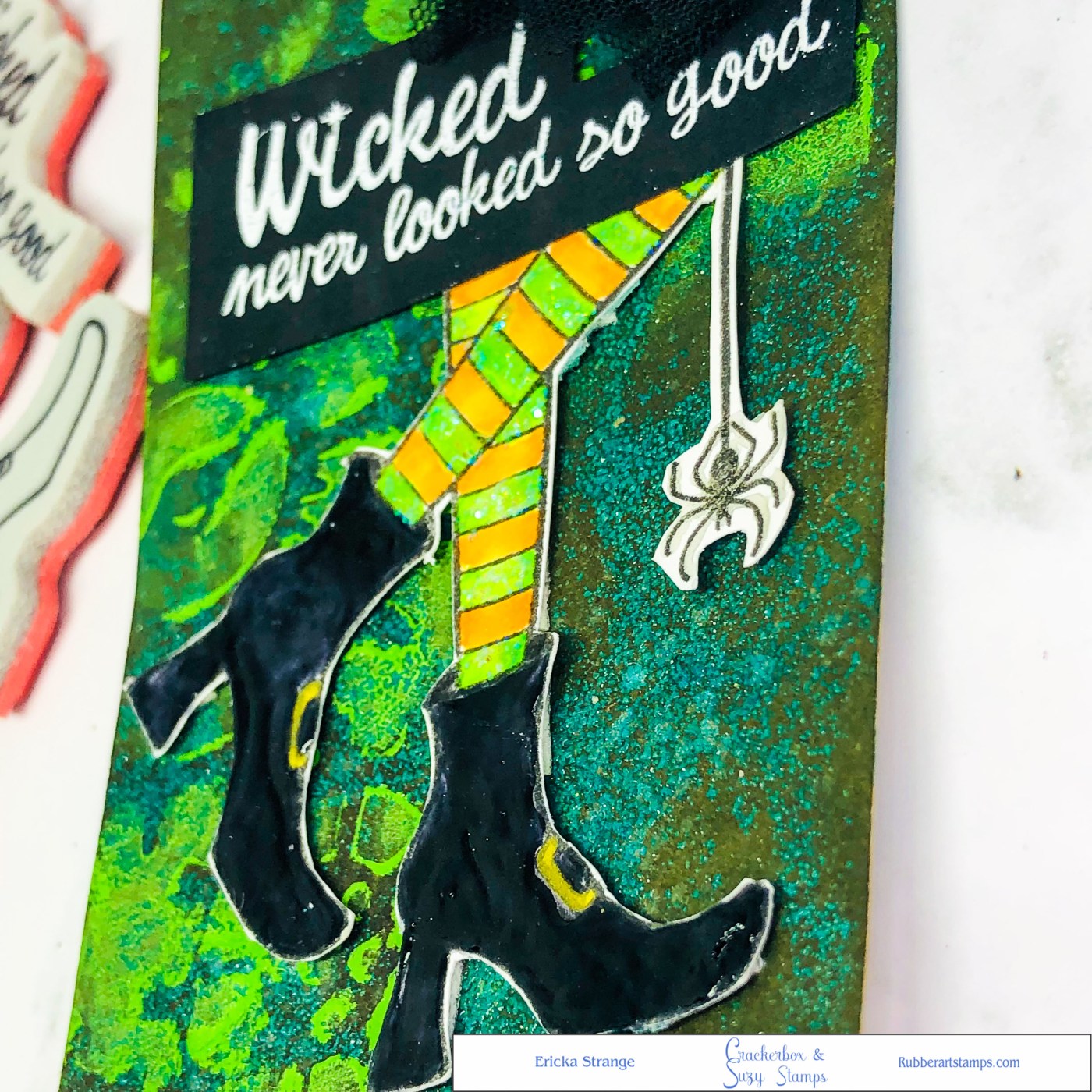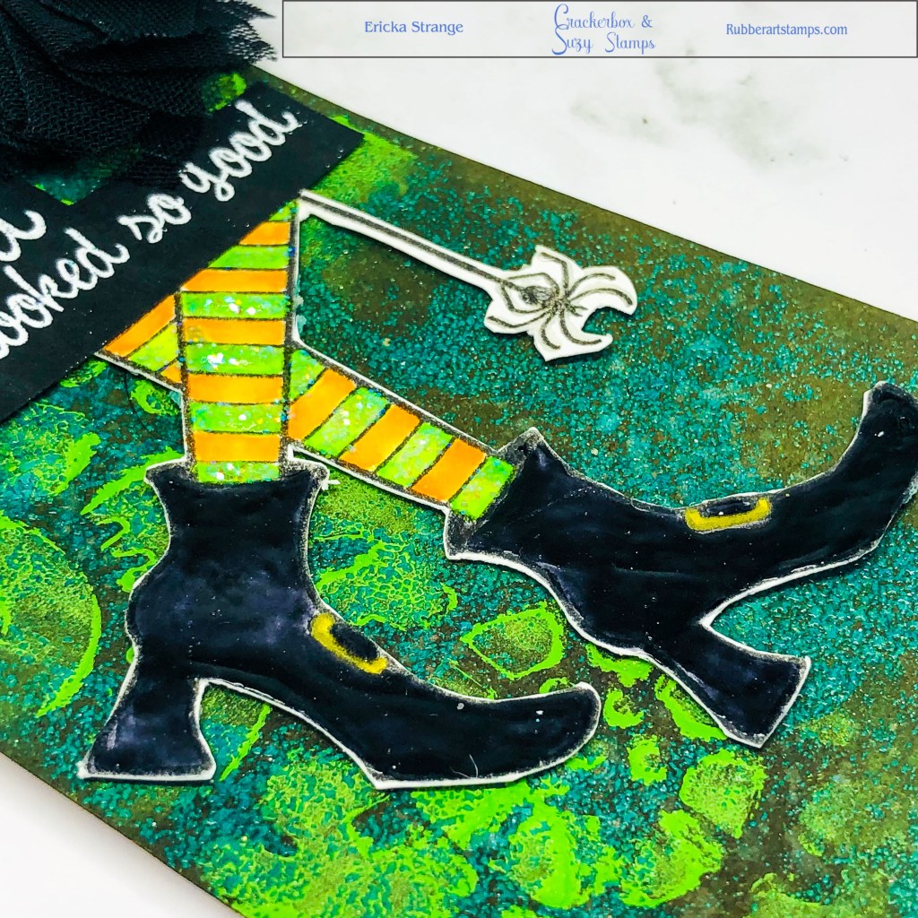 I started with a tag that I had previously made using Distress Crayon with a stencil. I stamped Witch’s Boots with Copic friendly ink and colored them up. I added Nuvo Drops to the boots to give them a patent leather look and then added Ranger Stickles Glitter Glue on the socks for sparkle.