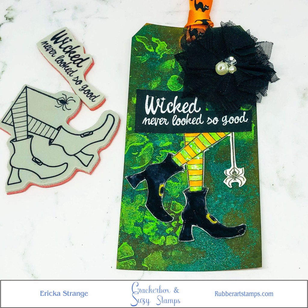 Hello crafty friends! The weather here in Texas is cooling off a bit so its feeling a little like fall which gets me in the mood for some Halloween. Today I’m creating a Halloween tag using the Crackerbox Witch’s Boots along with the awesome Wicked sentiment. I love these boots and they paired so well with this sentiment.