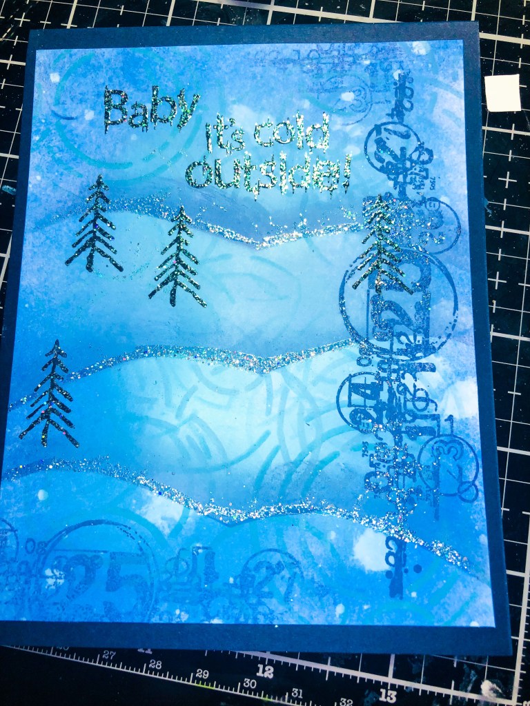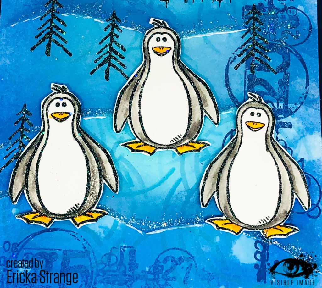 This set is so fun and I thought I would make a card with these cute penguins. I started with some ink blending on my background. I used Distress Oxides in Speckled Egg, Salvaged Patina, Prize Ribbon, and Chipped Sapphire. I also used the Ripples stencil to add a little texture to my background. I used my embossing pen to add some sparkle to my homemade hills.