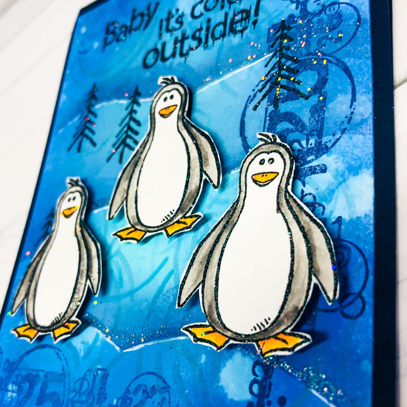 This set is so fun and I thought I would make a card with these cute penguins. I started with some ink blending on my background. I used Distress Oxides in Speckled Egg, Salvaged Patina, Prize Ribbon, and Chipped Sapphire. I also used the Ripples stencil to add a little texture to my background. I used my embossing pen to add some sparkle to my homemade hills.