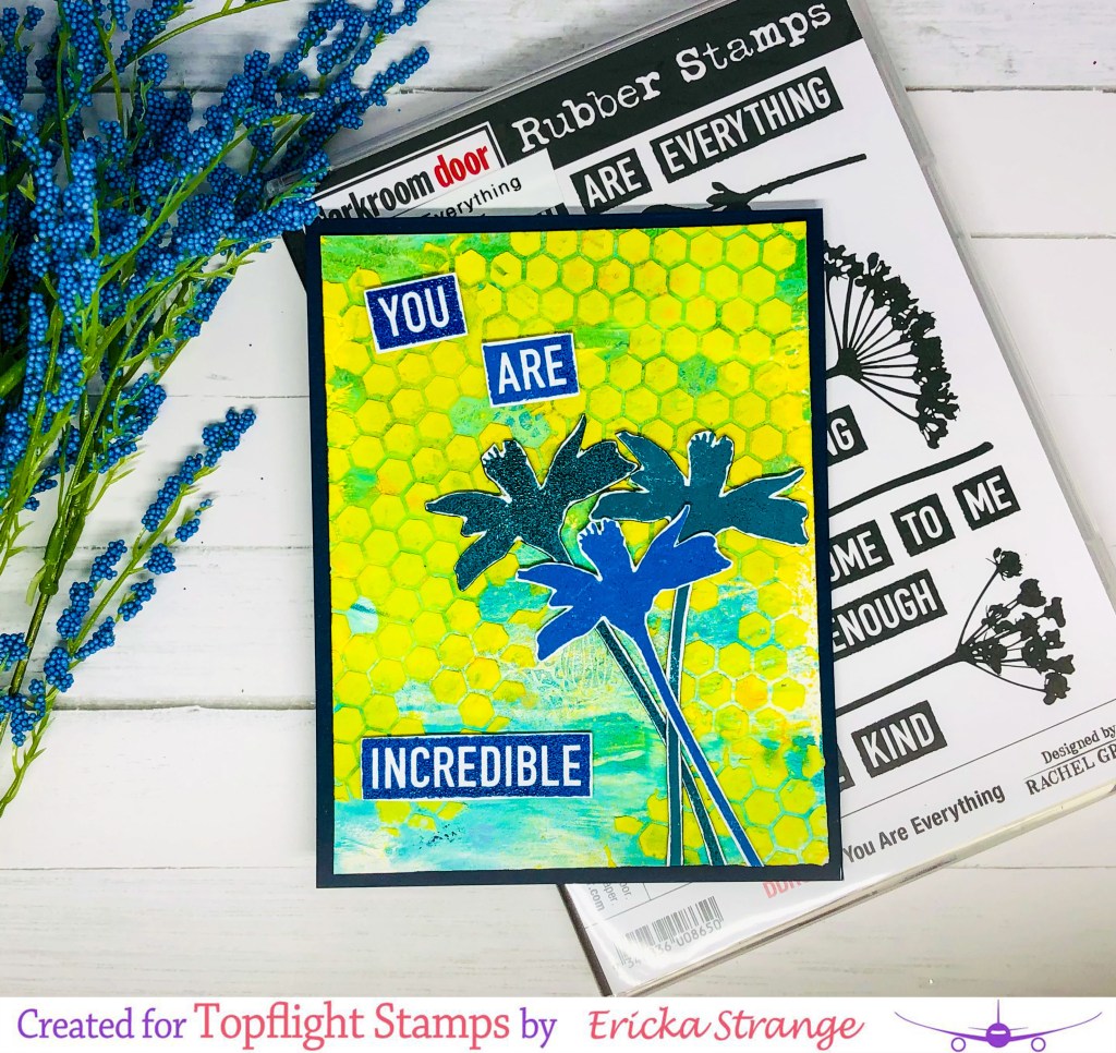 I used texture paste with the Honeycomb stencil and let it dry. I then used some yellow spray to add color to the texture paste. Then, I stamped the flowers and sentiment from the Darkroom Door You are Everything set with the Lavinia Dye Ink in Mermaid and Blue Lagoon.