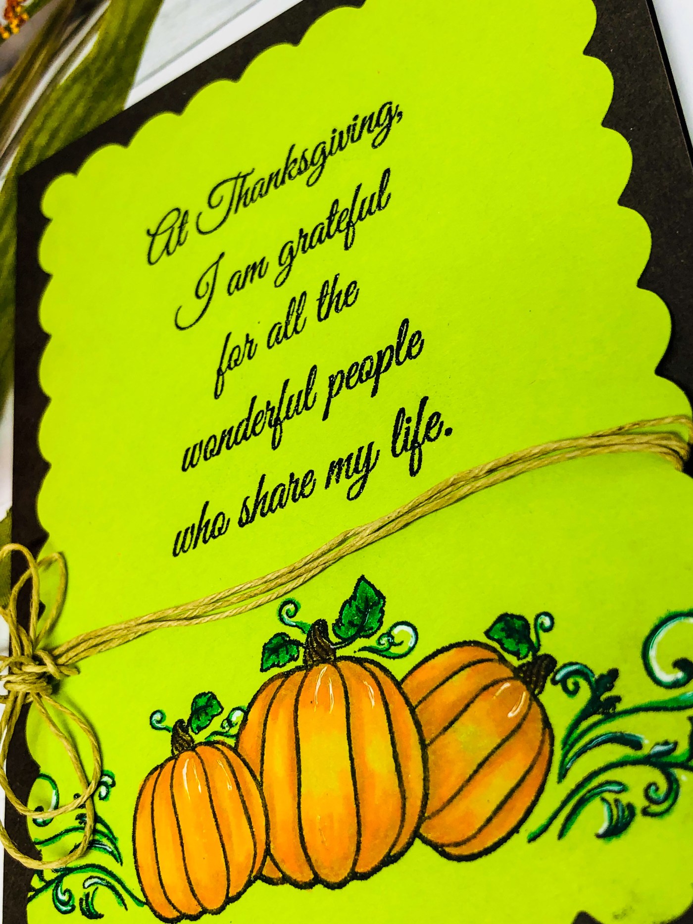 To create my card, I stamped the sentiment and pumpkins in Versamark black ink and clear heat embossed it. I then colored up the pumpkins with my colored pencils and added a little white gel pen to them.