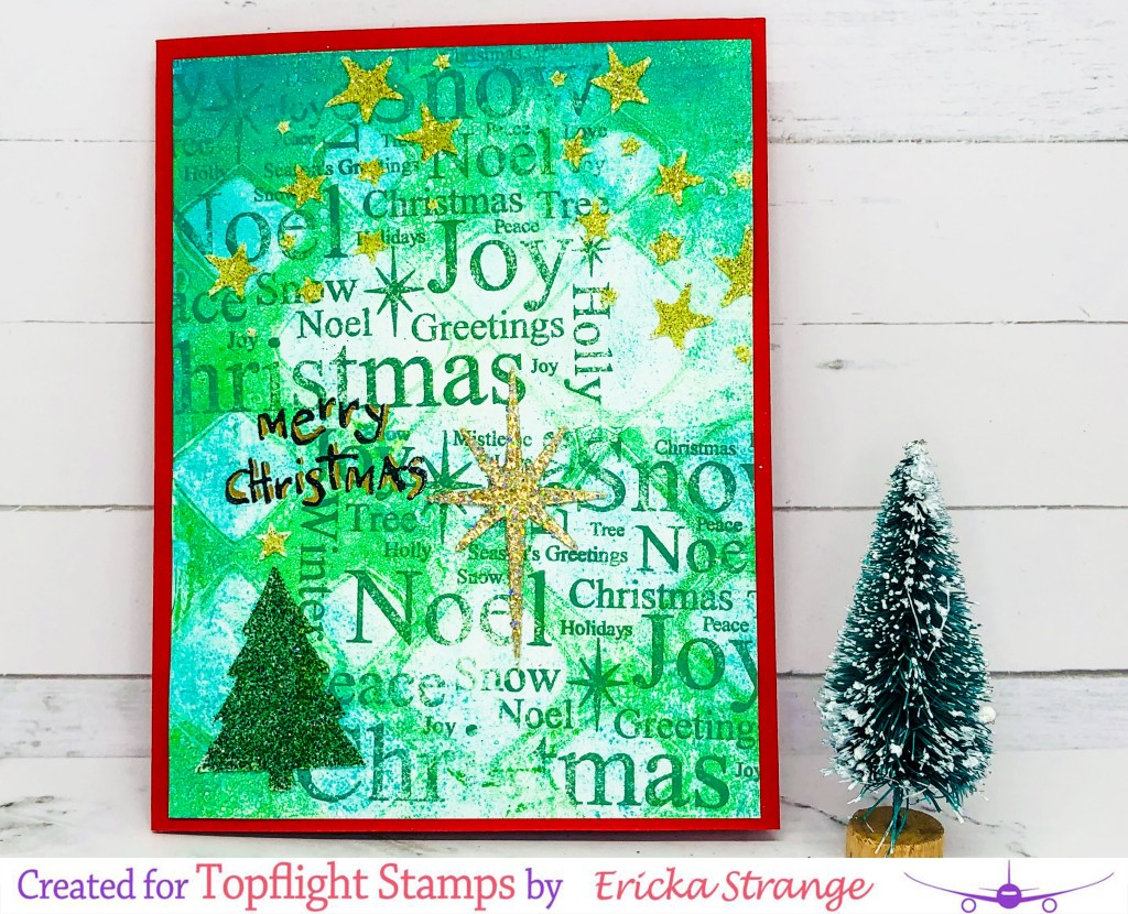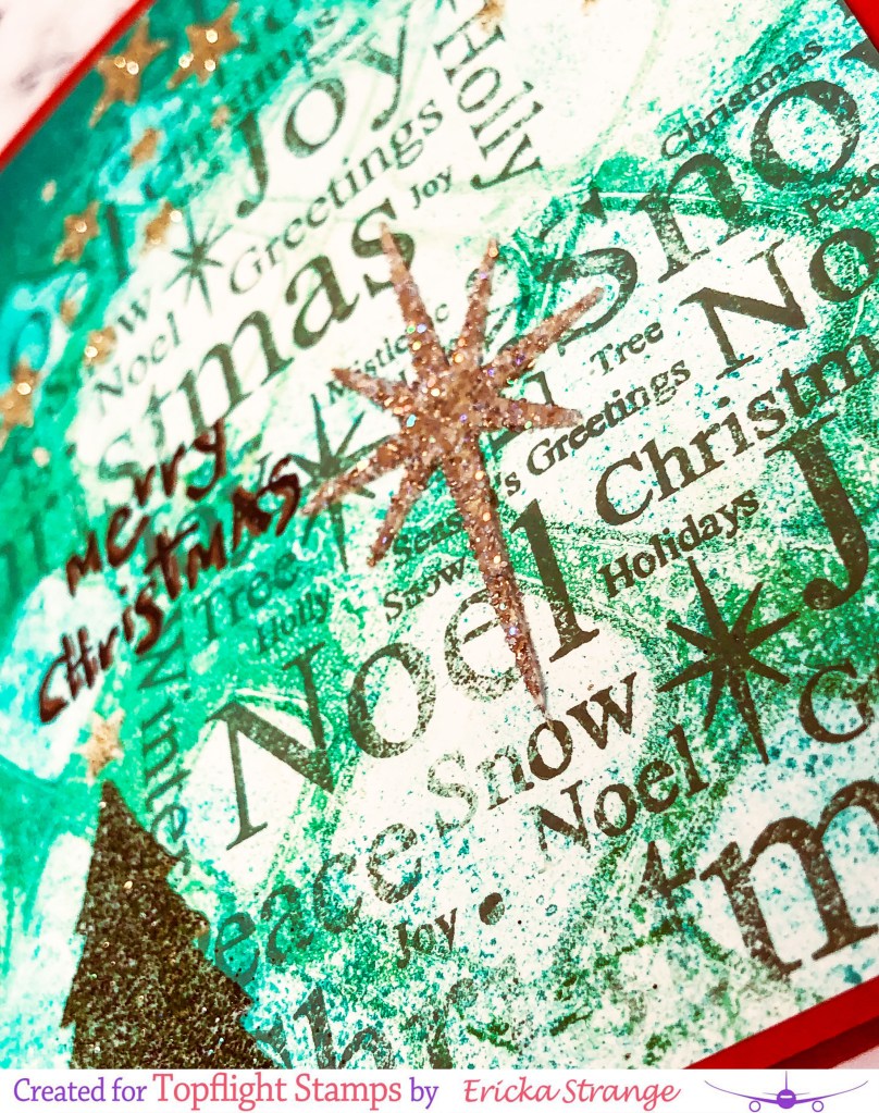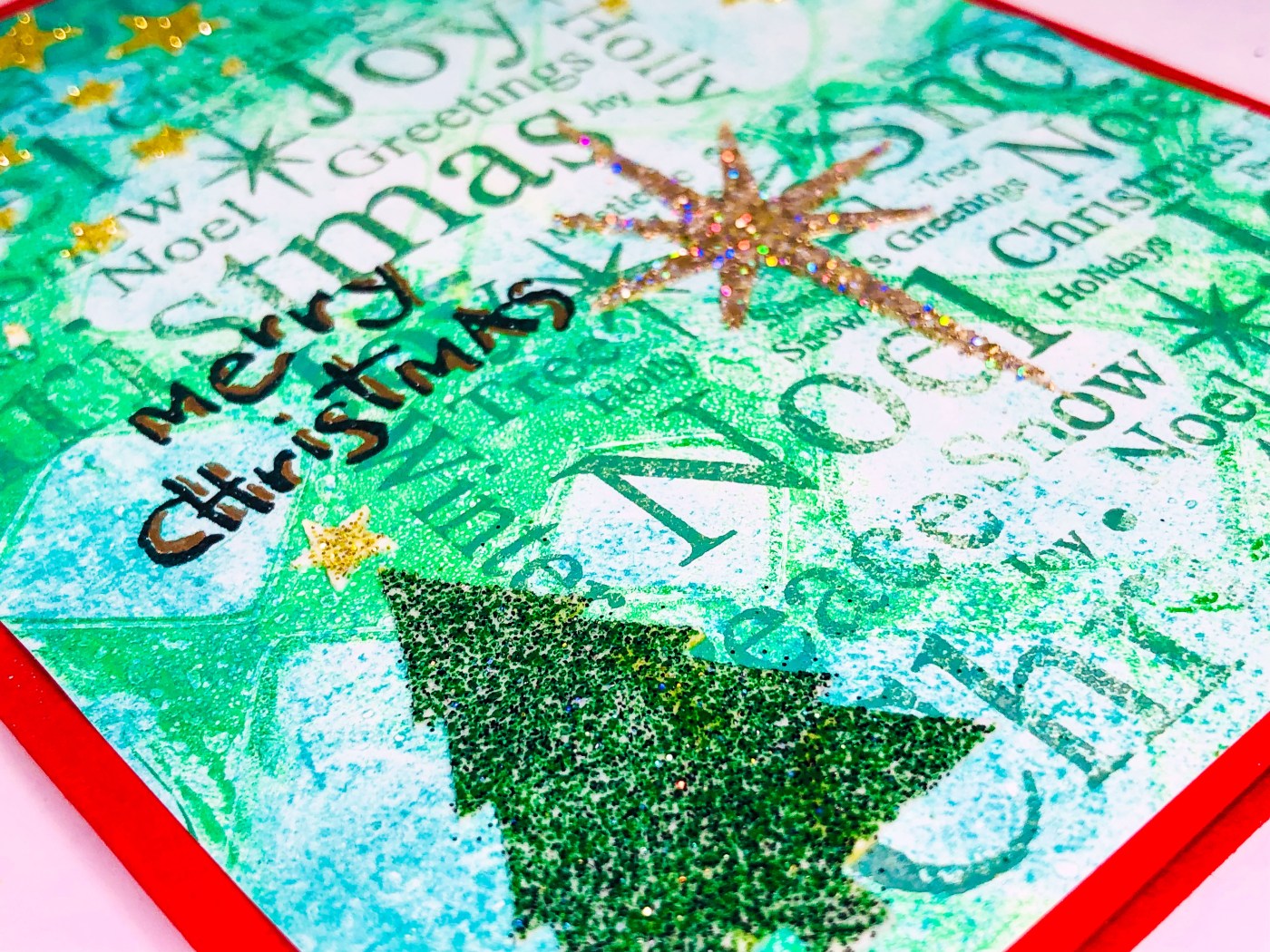 I started with a gel press print that I had made using the PaperArtsy Fresco Paints in Gumboots and Cerulean and the PaperArtsy JOFY PS230 stencil. I then used the Visible Image Christmas background stamp with the new Distress Oxide in Rustic Wilderness. I then used the Visible Image Iconic Christmas stencil with texture paste and embossing powders.