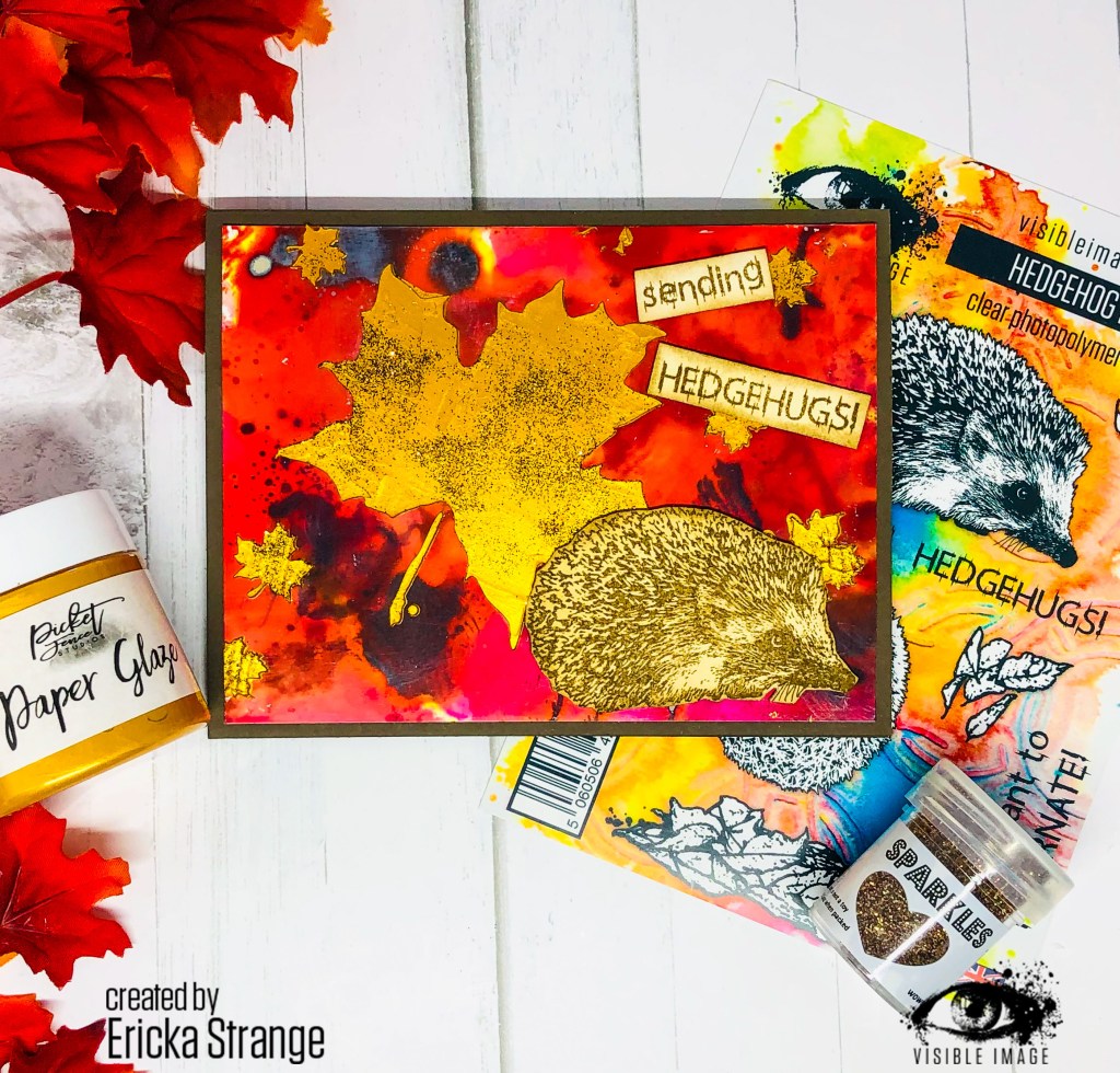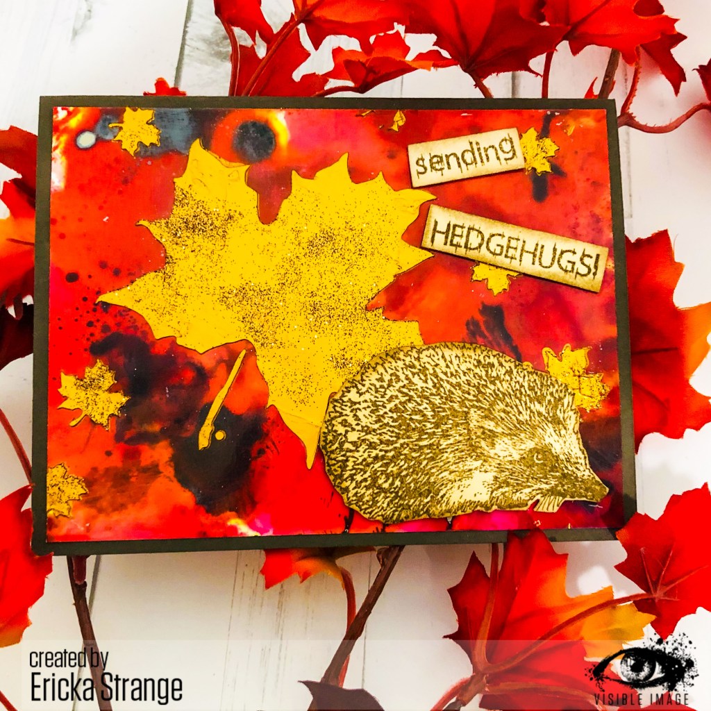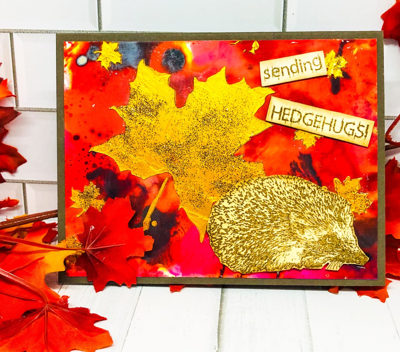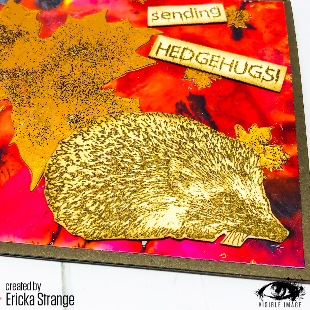 I stamped my cute hedgehog and sentiment from the Hedgehog Hugs set in Versamark Sepia ink and clear embossed him. I then added a little distress ink blending in Antique Linen and Gatherd Twig. Tom finish my card I fussy cut him out and added him to my background with foam tape.