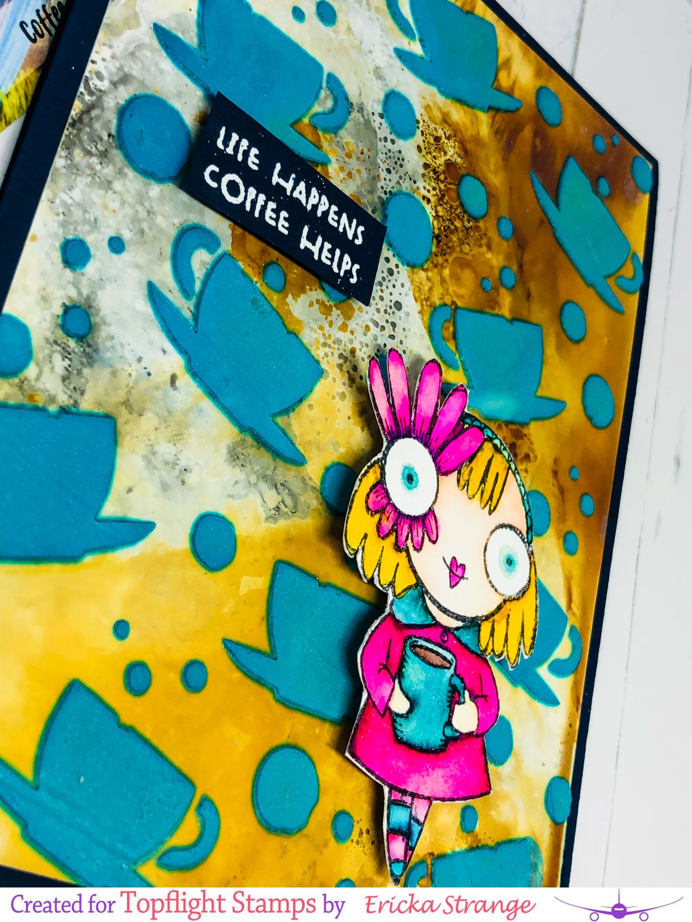 I started out with a Distress Oxide background I made using photo paper. I love the look of the oxides on the photo paper and the vivid colors you get once you wipe off the oxide part on the paper. I then used the Visible Image Tea Party stencil and Cosmic Shimmer paste colored with Mermaid ink from Lavinia. This stencil is so much fun and perfect for any coffee card.