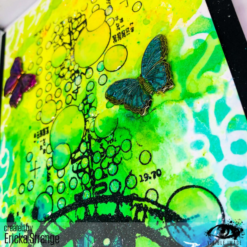 I then added some “extra” details I had in my stash to stash. I heat embossed the key and locket with Emerald Creek Patina Oxide and added it to my project. I also found some metal butterflies and colored them up with some alcohol inks and heat embossed them with Emeral Creek Vintage Beeswax to add some shine.