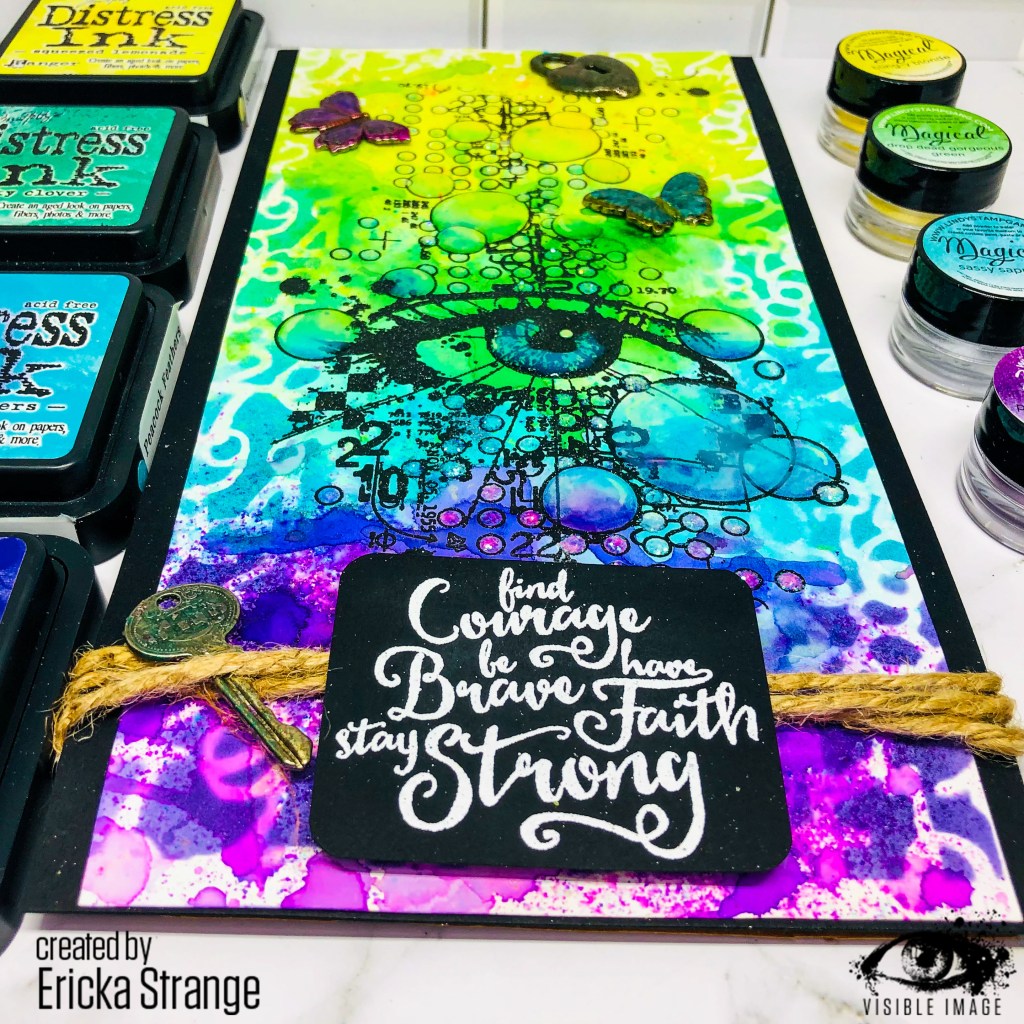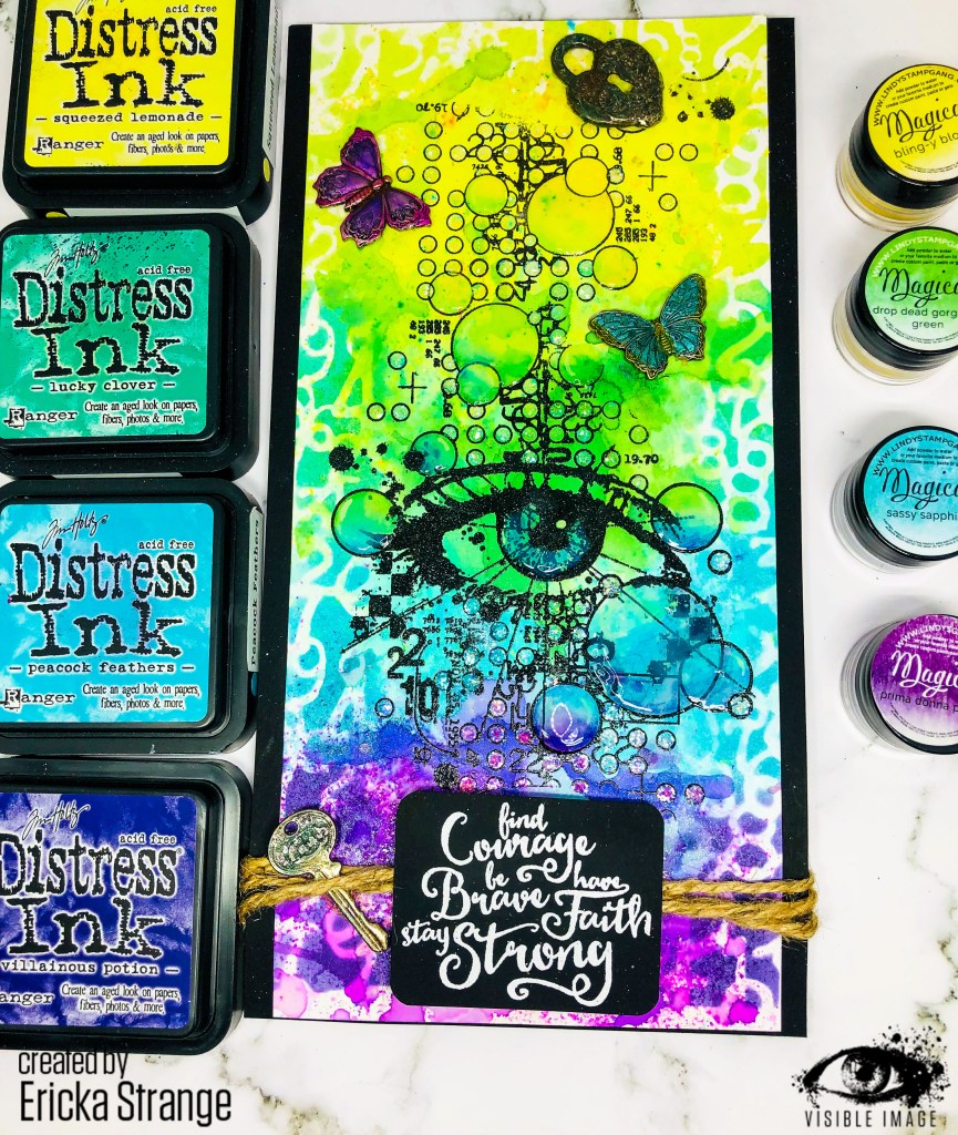 I love this beautiful 2020 Vision stamp from Visible Image and paired it with this awesome sentiment from the Visible Image Brave and Strong set. I started by using Bristol Smooth paper, size 8x 5, and Lindy’s Magical powders which are powdered dye based pigments with a beautiful sparkle. I used them in rainbow order and added spritz of water until I got the look I wanted.