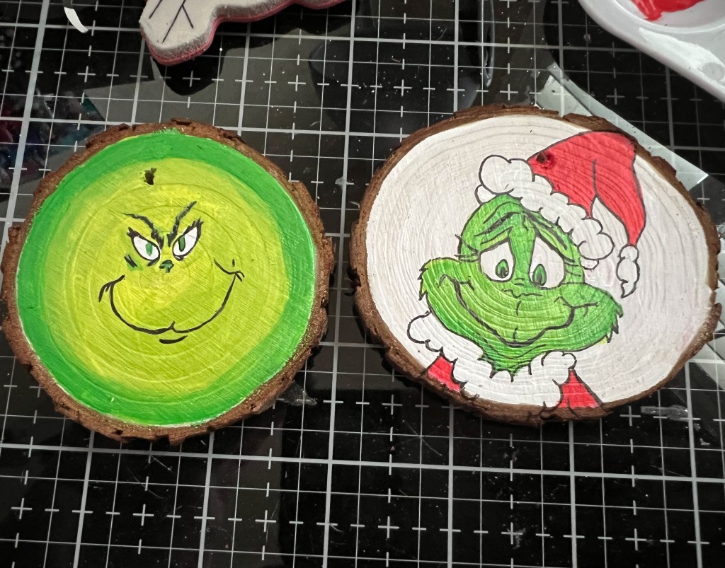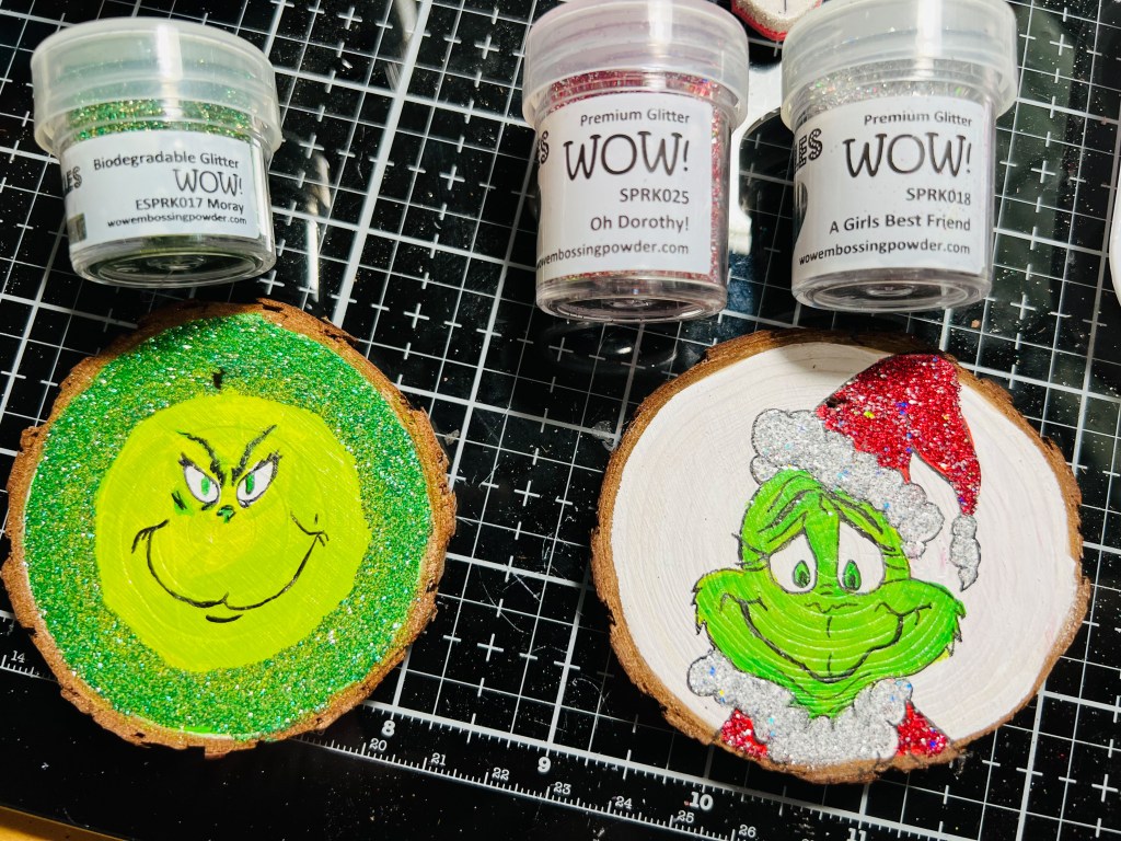 I had these wood rounds in my stash from last year and thought it would be fun to make some Grinch ornaments. I started using a layer of white gesso on the rounds and then stamped the Grinch and Grinch Face of them using Archival Ink.