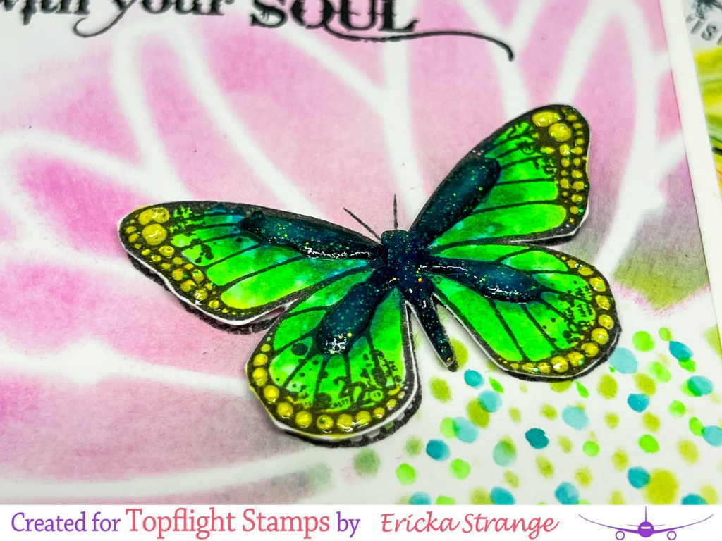 I stamped the butterfly from the VI Minis set on my background as well as on a separate piece of paper to color it up with my watercolor markers. I then added glitter drops to add some sparkle to my butterfly.