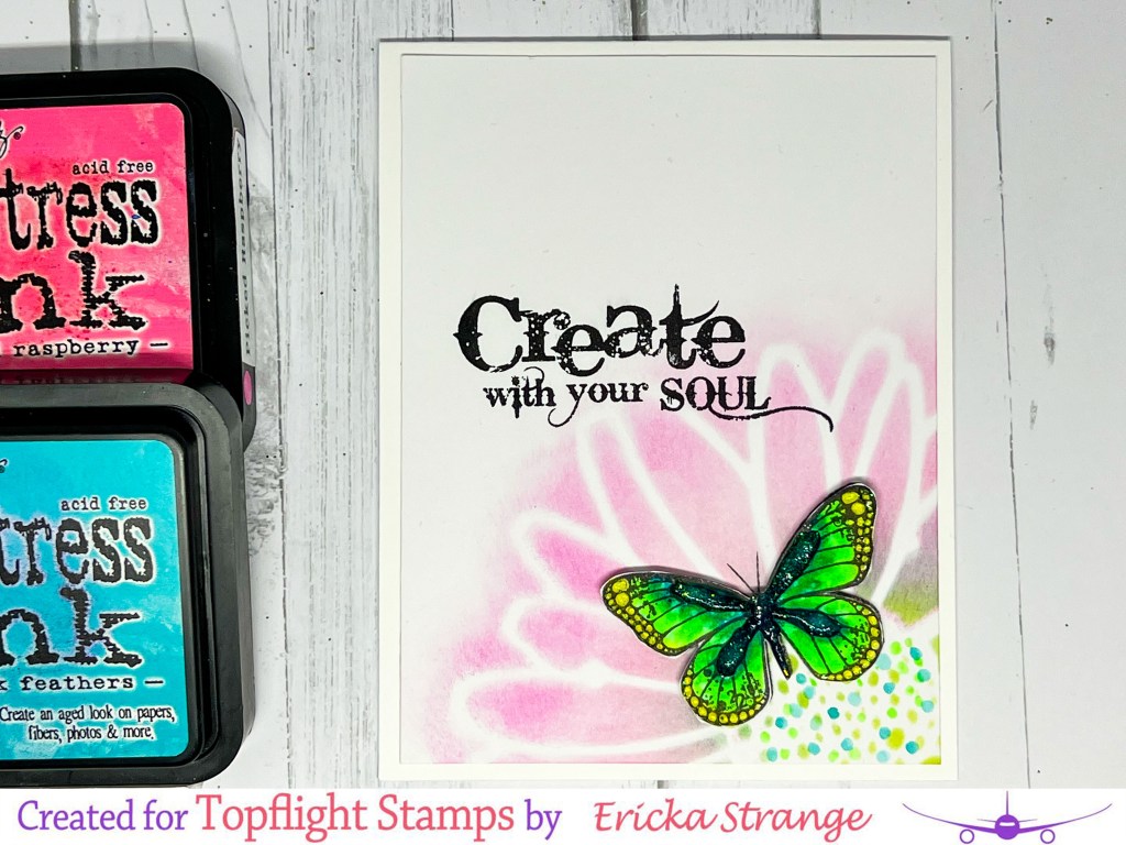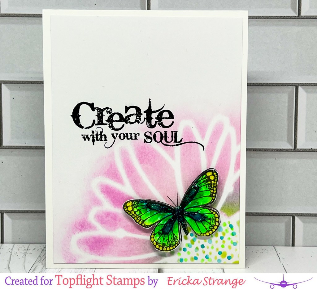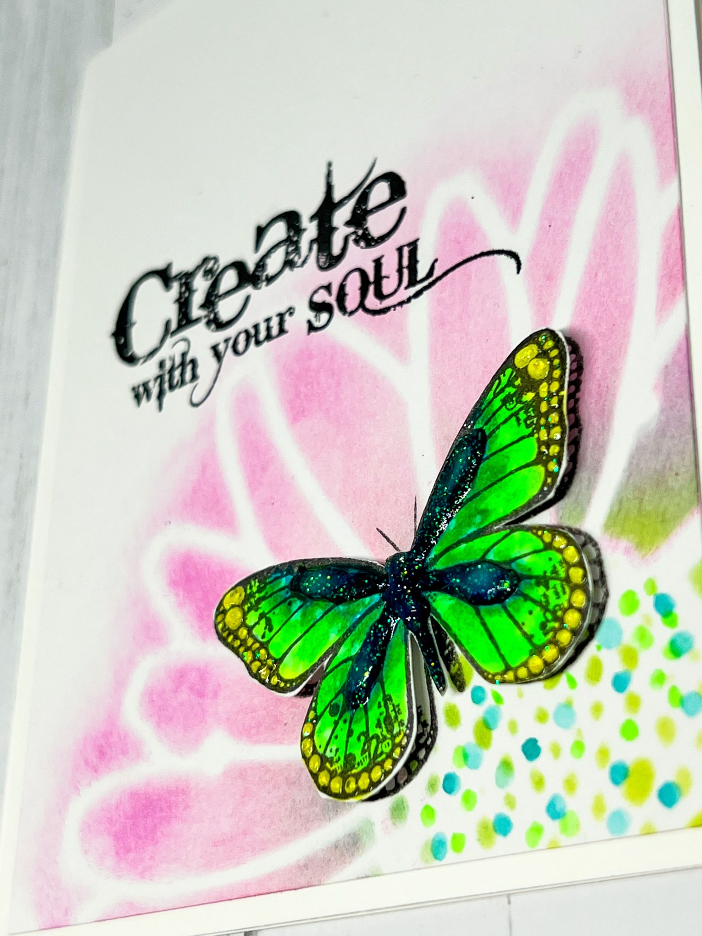I then cut out my butterfly and attached it to the background with foam tape. To finish my card I stamped this great sentiment from the Create With Your Soul set.