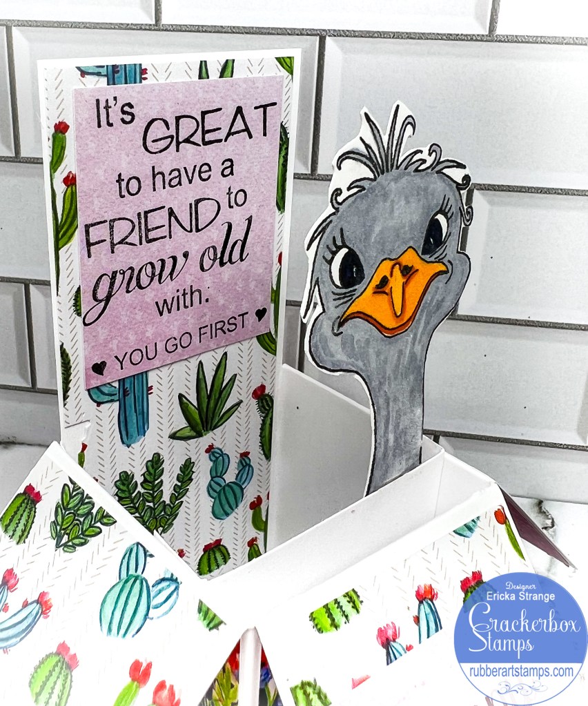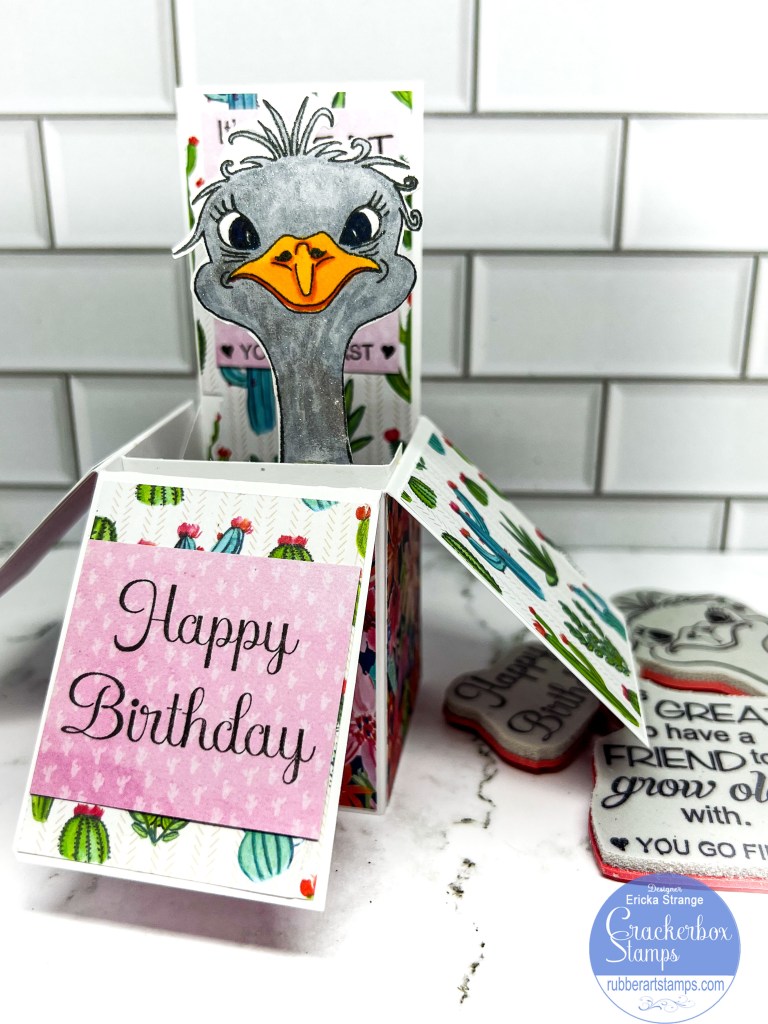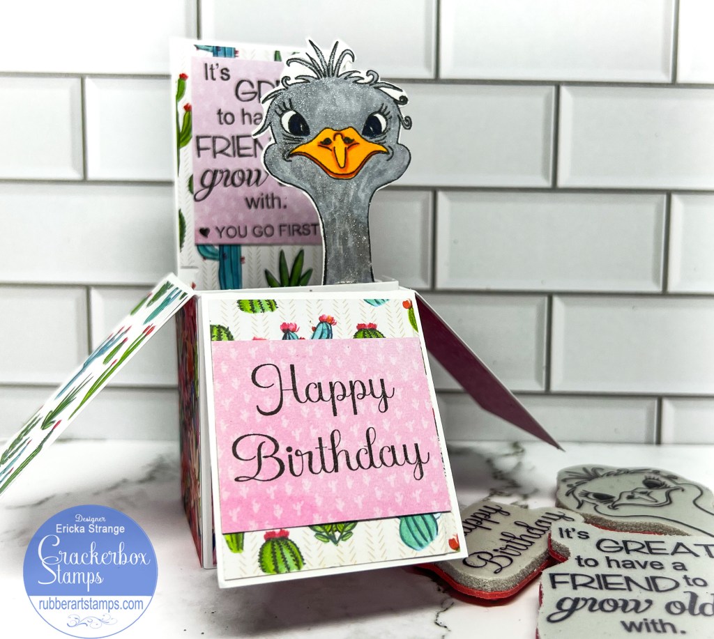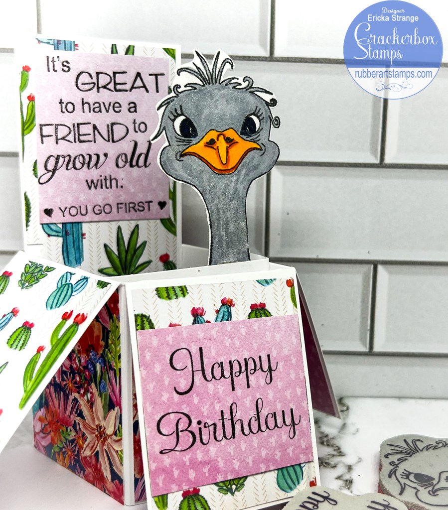 I hope you are all having a wonderful New Year! I’m over on the Crackerbox Stamps blog with a birthday card I made for a friend. I love using this box card with pattern paper for a fun interactive birthday surprise. I thought it would be fun to have the Emu Adele popping out of my card.