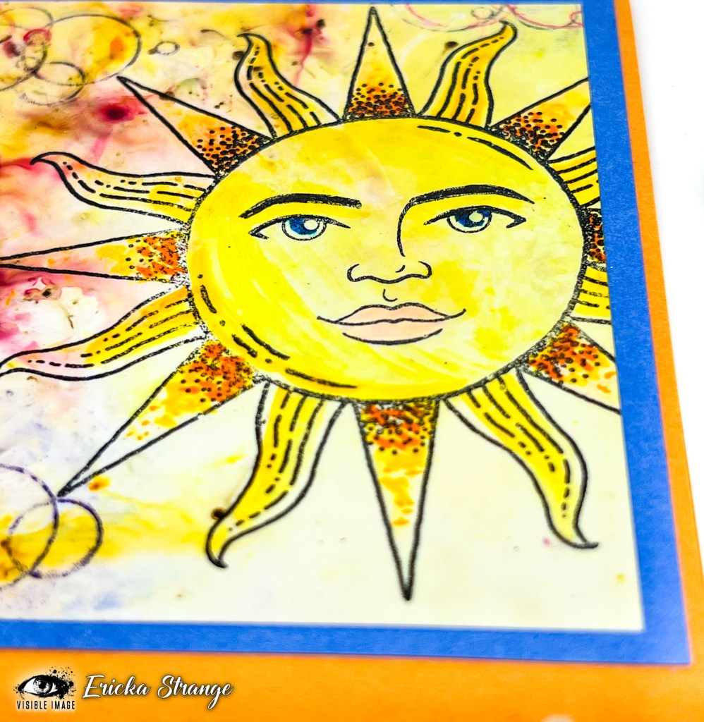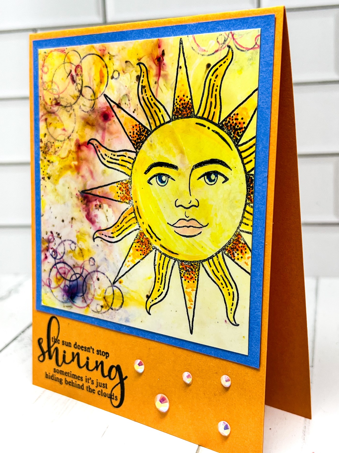 Once my background was dry, I stamped the sun image with Archival Ink and added additional color using Zig Clean Color Real. Brushmarkers. I used Distress Oxide in Kitsch Flamingo and Prize Ribbon to add circles on the corners of my background.