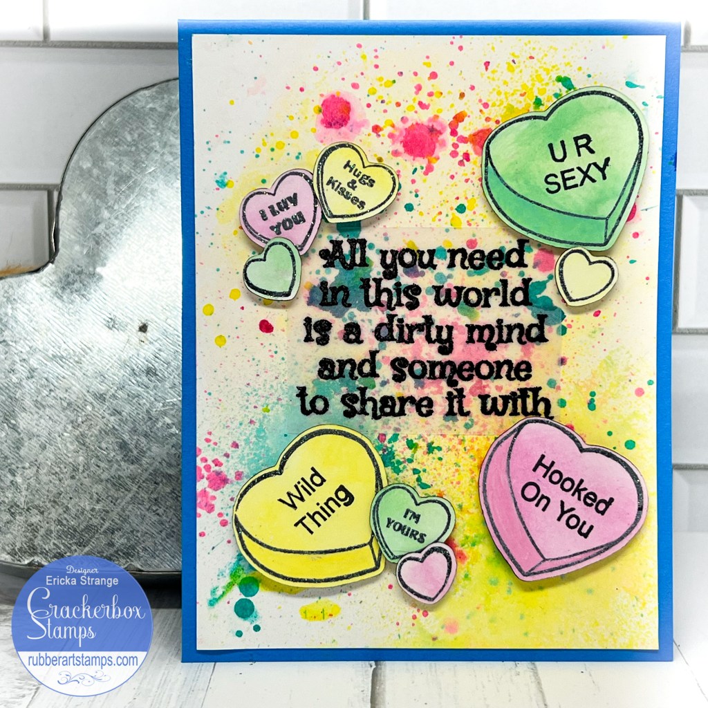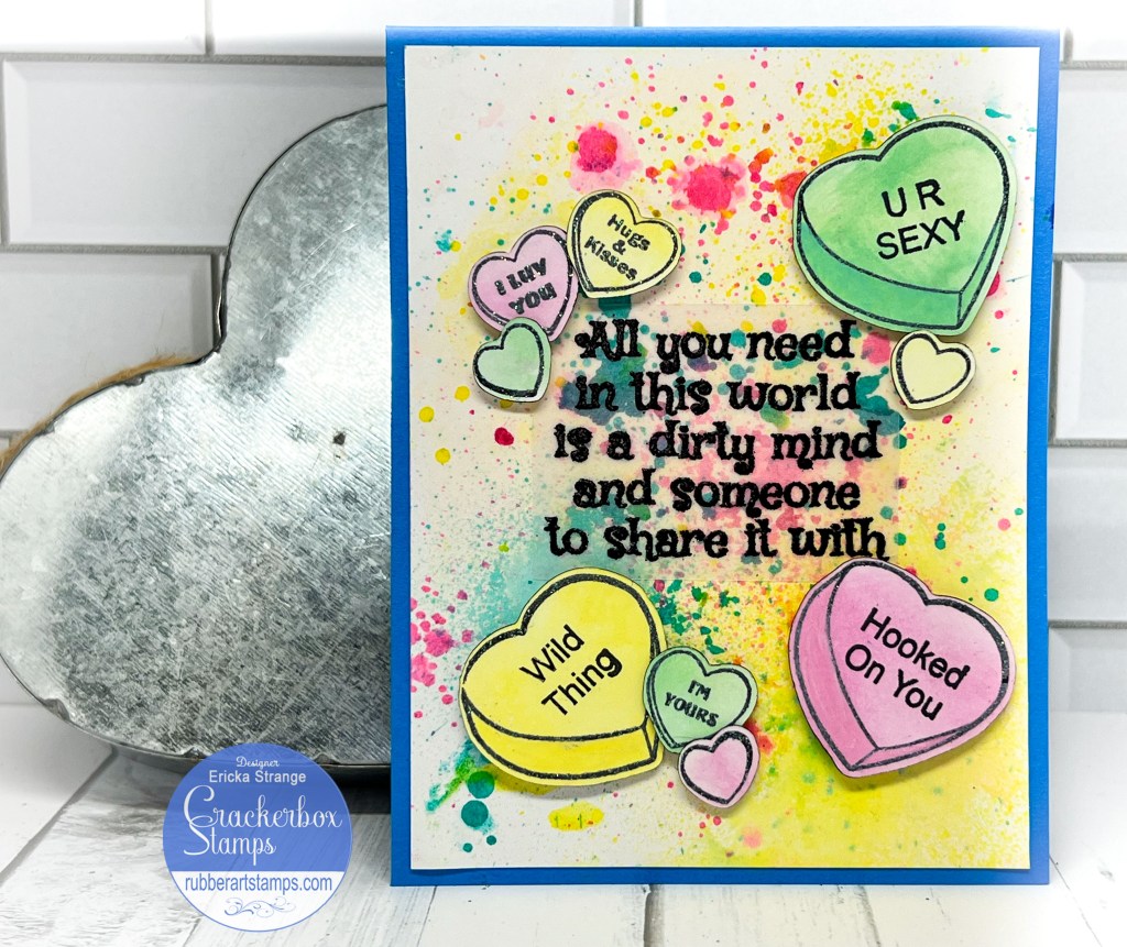 I can’t believe that it is almost February! Today I am on the Crackerbox Stamps blog with a colorful sassy Valentines card using the their new release. When I think of Valentines, I think of candy hearts so when I saw the Candy Hearts and Sassy Sayings, I knew I wanted to create a card for my honey.