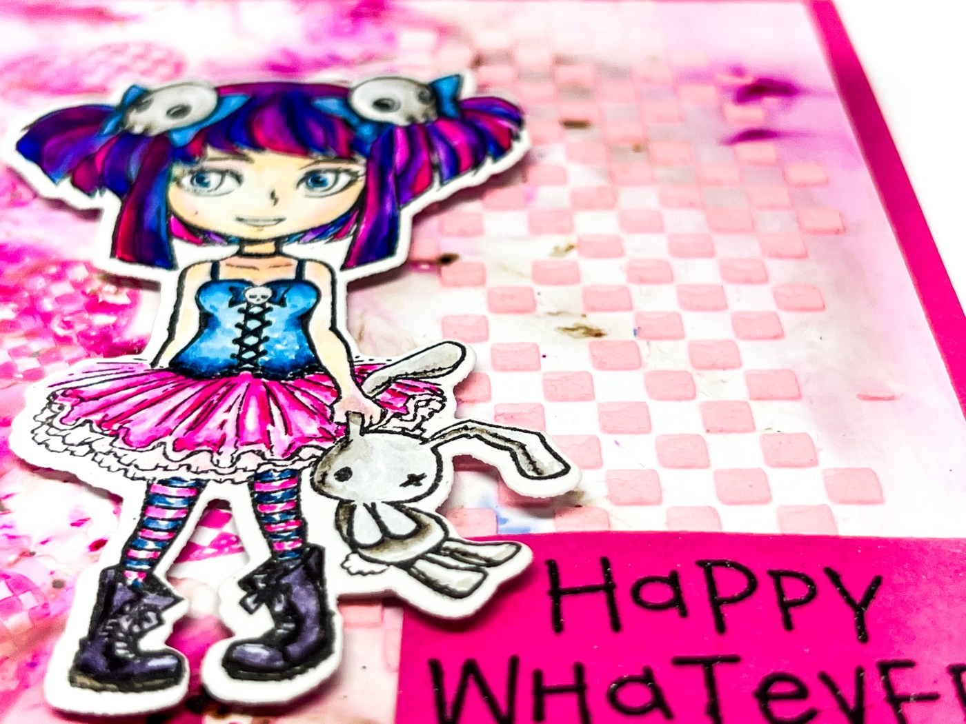 I stamped Molly with Black Archival ink and colored her up with Zig Clean Color Real Brush Markers. I wanted her hair to be fun and multicolored, so I used the Spectrum Noir Sparkle Glitter Brush pens to add some fun attitude to it.