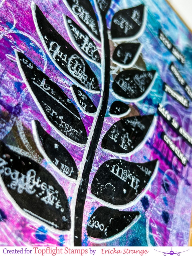 Taking the PaperArtsy Tracy Scott PS226 stencil, I traced and colored in the leaf with a black pen. I then added the script stamp from the PaperArtsy Seth Apter 25 set in white ink to add some more interest to my background. I also highlighted the leaf with a gel pen.