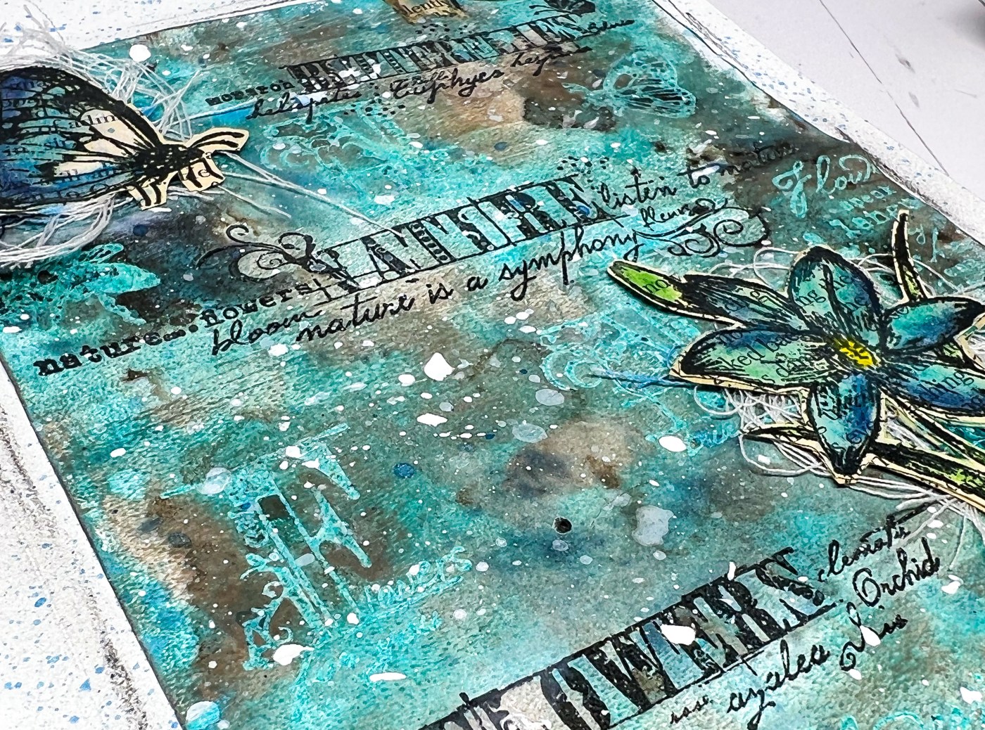 I started my page with a gel press print I created using PaperArtsy Fresco Paints in Aquamarine, Beach Hut, Mud Splat, and Truffle. I then started stamping the beautiful stamps in the Flowers and Nature set randomly on my paper with both white and Versamark ink and heat embossing it with WOW! Embossing Powder in Glassy Ocean.
