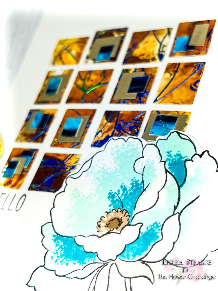 I arranged the pieces into a loose square and glued them down. I then tool the Altenew Airbrushed Flowers and stamped them in similar blues and browns to match the background.