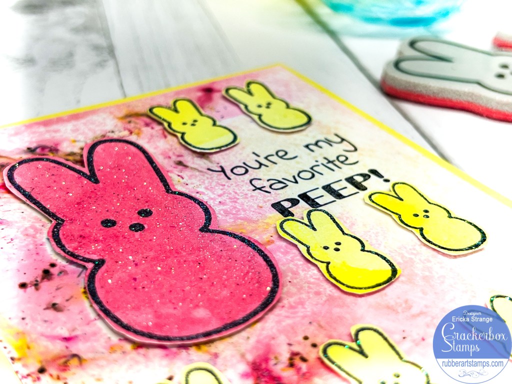 I started by creating my card with a photo paper background I had made using some watercolor powders and Shimmerz sprays. I then stamped the Peeps set of 2 and sprayed them with some shimmers sprays and cut them out.