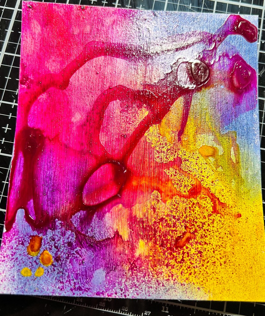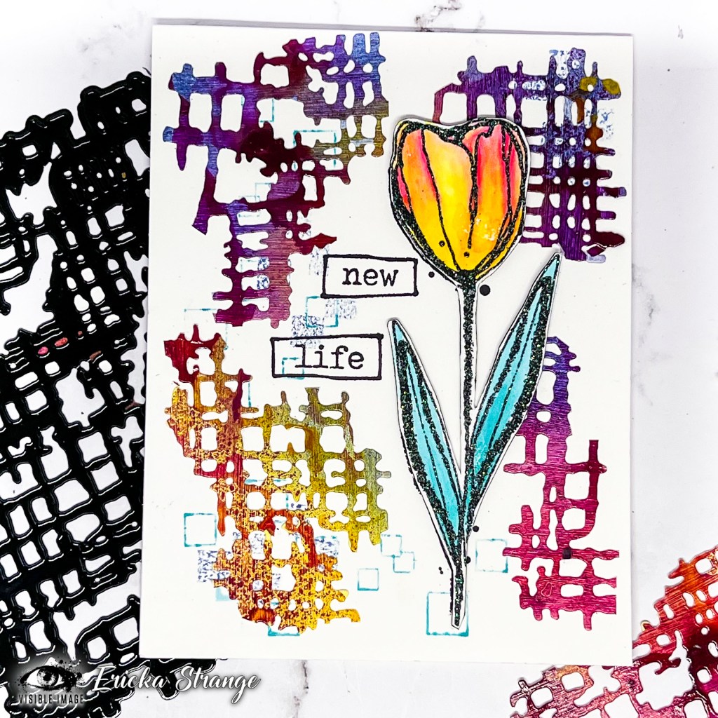 I took my acrylic background and used the Broken Mesh die to create texture on my card.