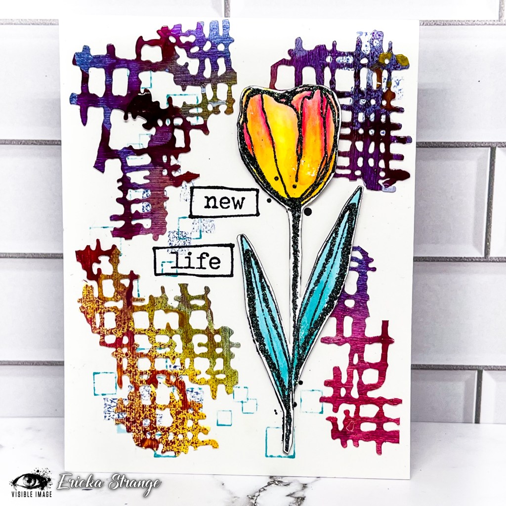 To create my card, I stamped the tulip with Versafine Clair Nocturn ink and heat embossed it with the sparkly WOW! Disco Ball powder. I then colored it up with my Zig Real Brush Markers and set it aside to dry. I found a background I had previously made (because I might have a problem saving paper lol) using the Ranger Dina Wakley Media Spray. This spray is fun to use as because it is acrylic, you always get a unique look.