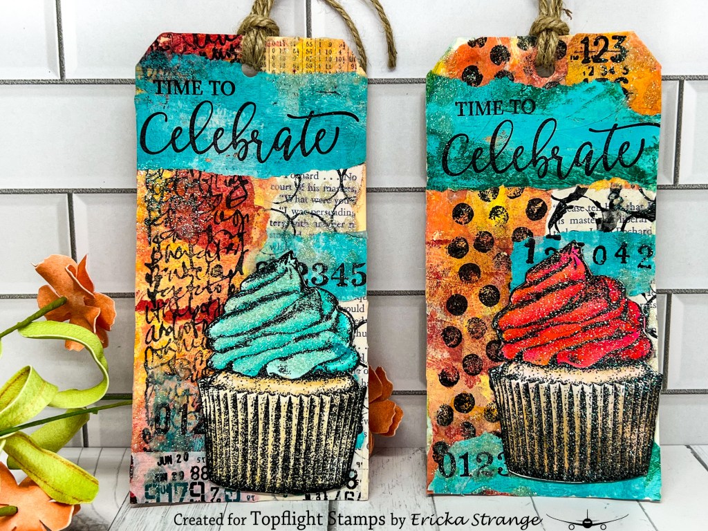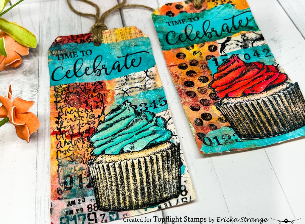I made some mixed media tags to celebrate the event using a variety of supplies available at Topflight Stamps.