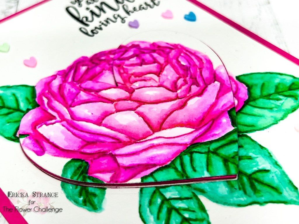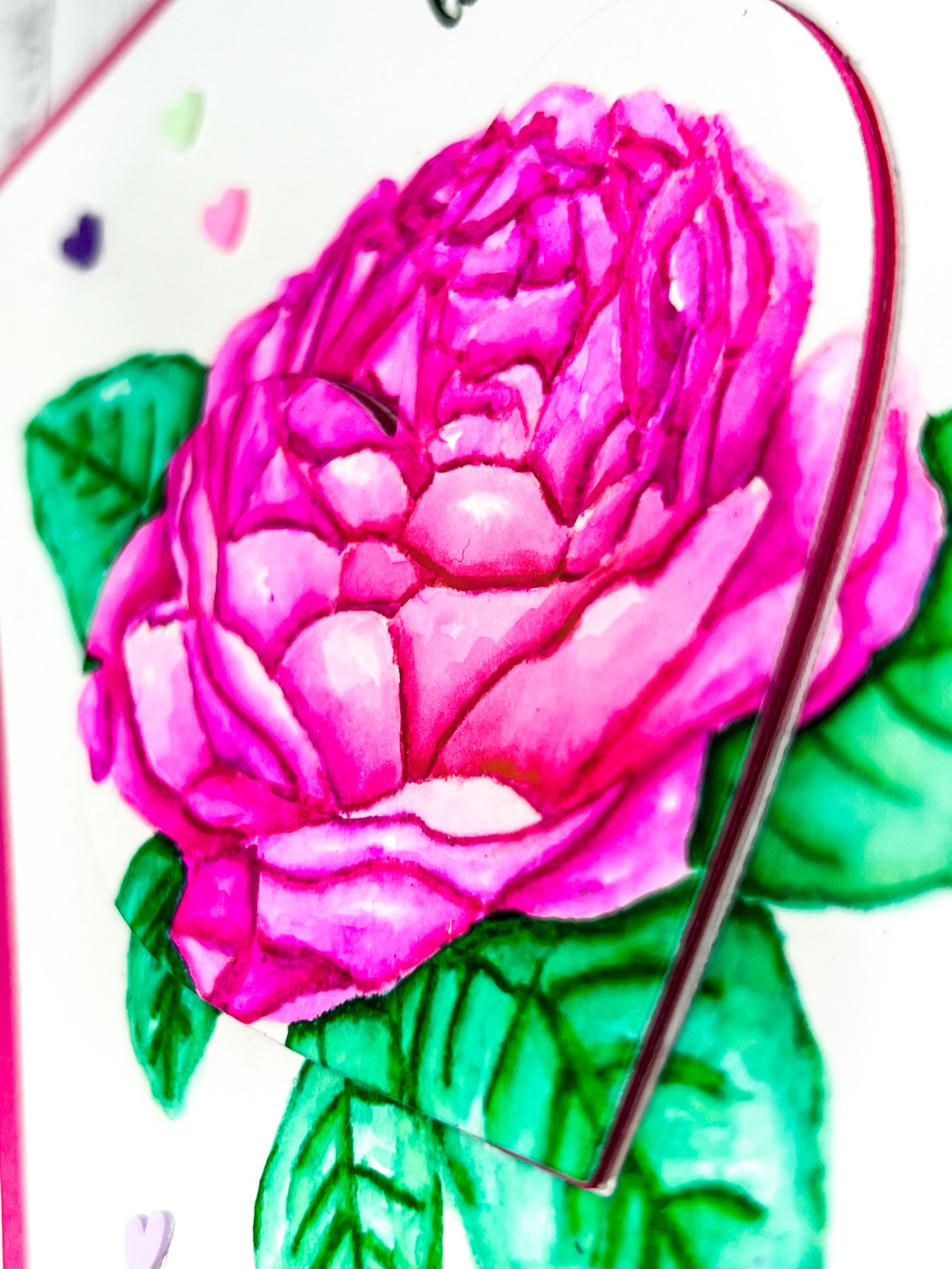 Once I finished watercoloring the rose, I used a die cut to cut a heart out. I also die cut the heart four more times to have several layers behind the flower to add dimension.