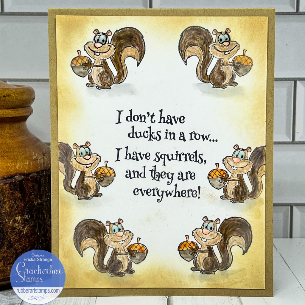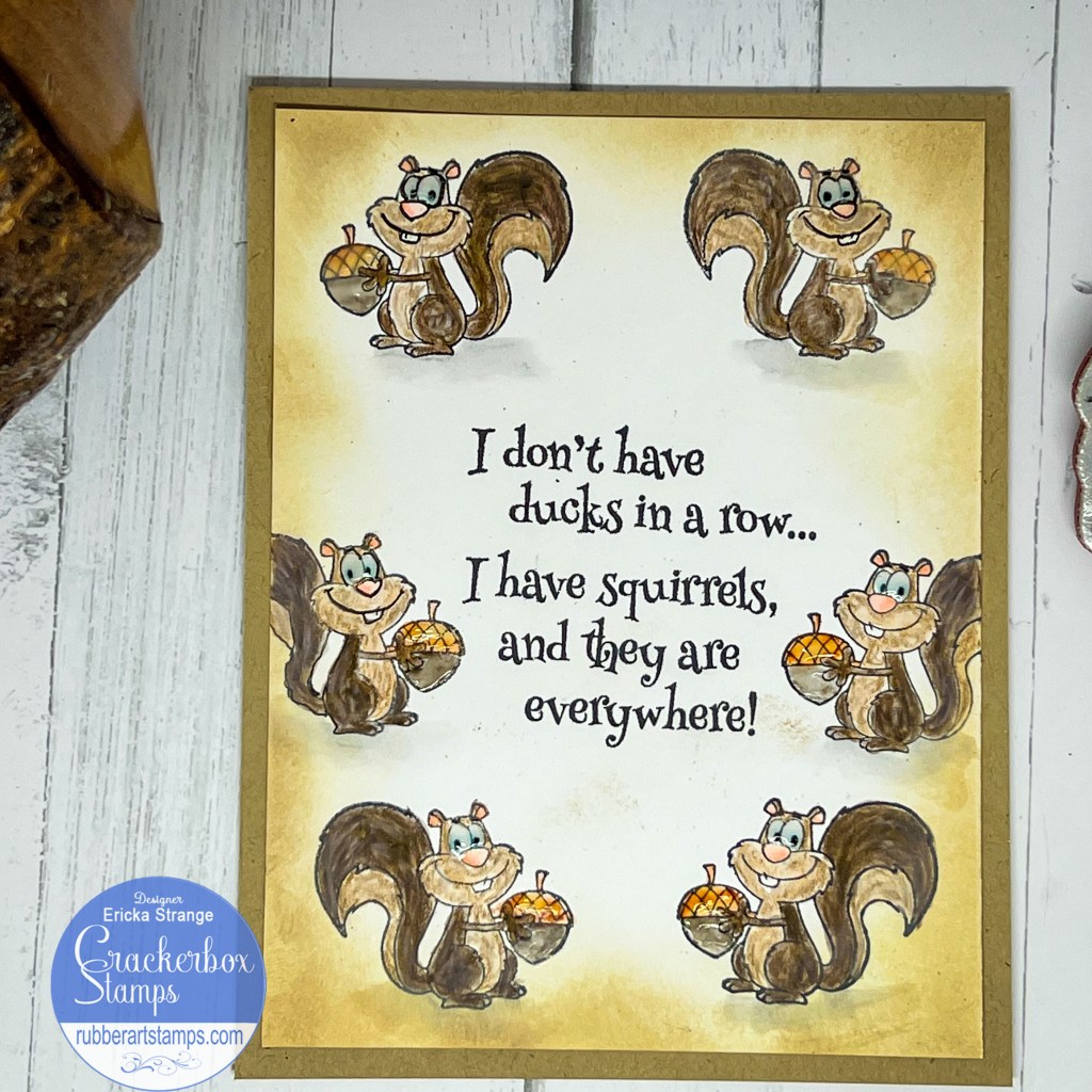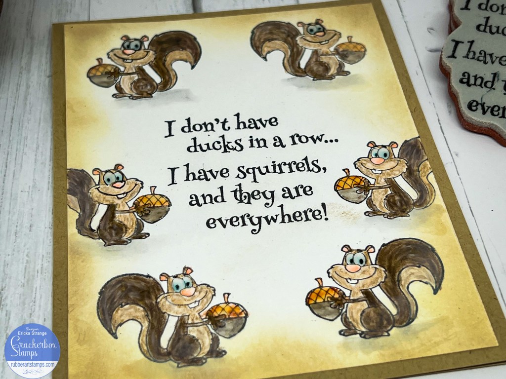 After stamping all my squirrels, I stamped the Don’t Have Duck in Row sentiment. I colored up my squirrels with colored pencils and added a little glossy accents to the eyes and nuts for some fun shine. To complete my card, I used some Distress Oxides in Antique Linen and Walnut Stain.