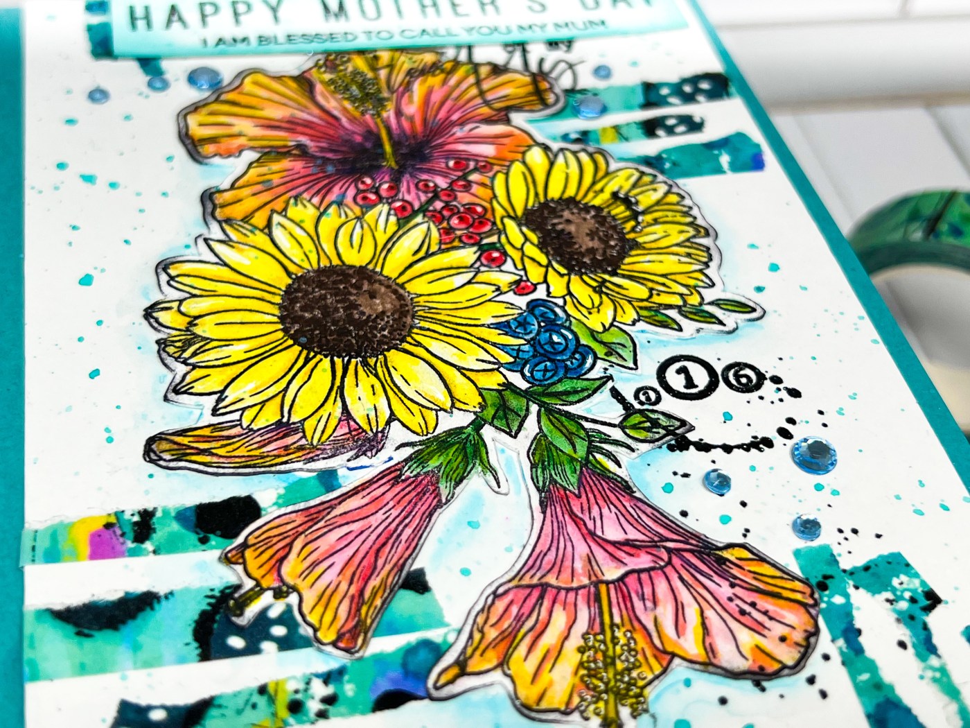 I stamped the flower image a second time to ensure I got all the beautiful details of this stamp down on my card. I glued the painted image on top of it and then added the Hunkydory Beautiful Blue Gemstones to the flowers in the middle for some fun sparkle. I also took the Hunkydory Boy Blue Glimmer Mist and splattered it around my card.