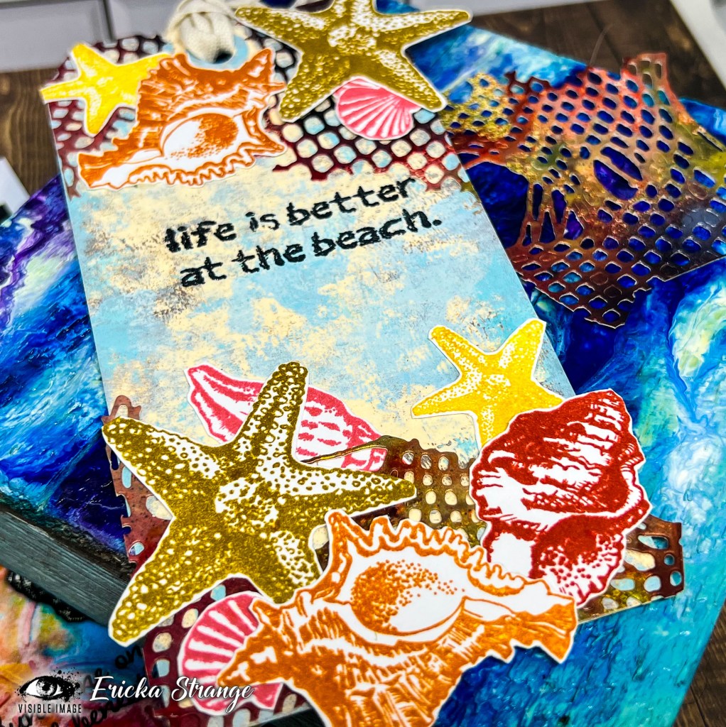 I had the Torn Fishnet die leftover from a previous project and decided to add that to my tag as well. I started placing and gluing my shells around my tag for a pretty beach look.