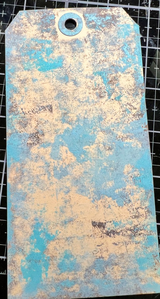I started with a manila tag and used my brayer with some PaperArtsy Fresco Acrylics in Aquamarine, Mermaid, and Taupe.