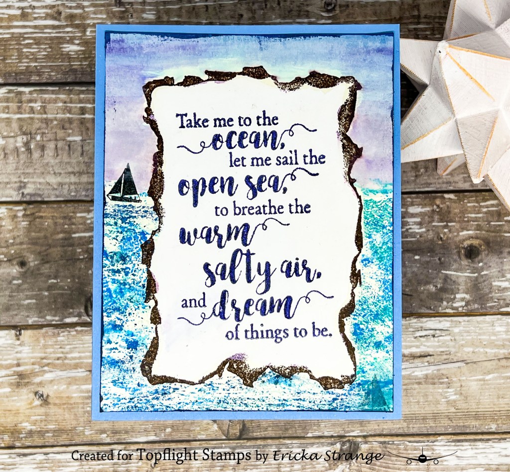 I started by stamping the Darkroom Door Frame Stamp Burnt Edge. I then made a mask of the stamp so that I could create an ocean scene around it.