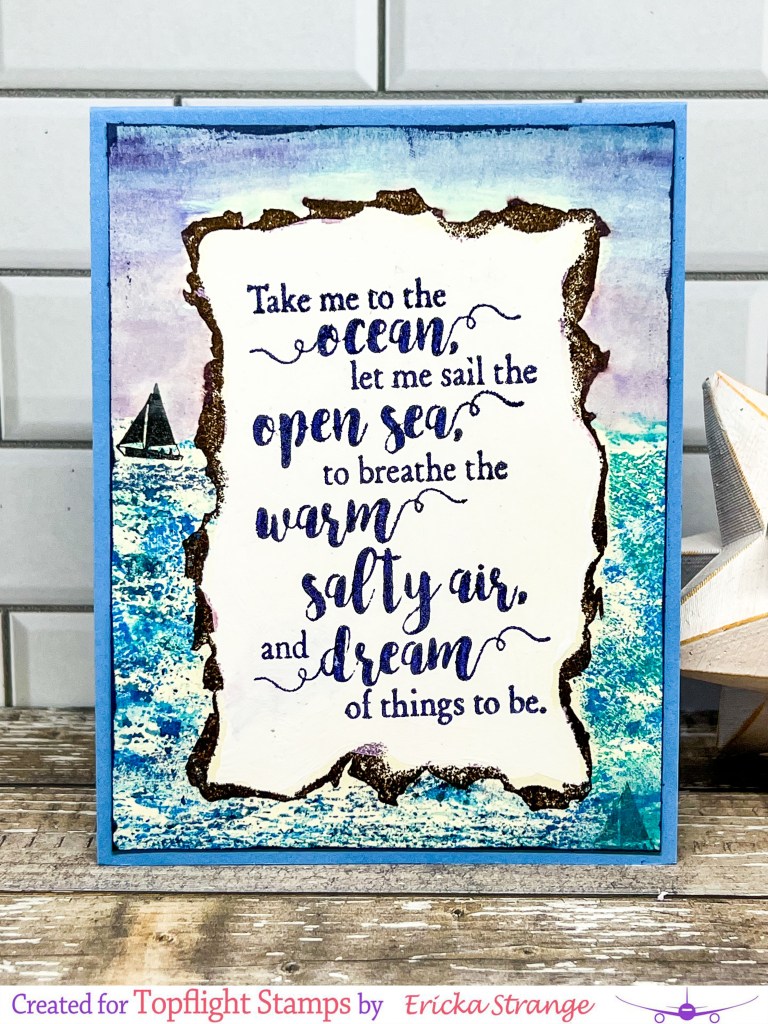 I then stamped the Darkroom Door Open Sea quote stamp in Versafine Claire Medieval Blue and clear heat embossed it. I love this quote and the curly script.