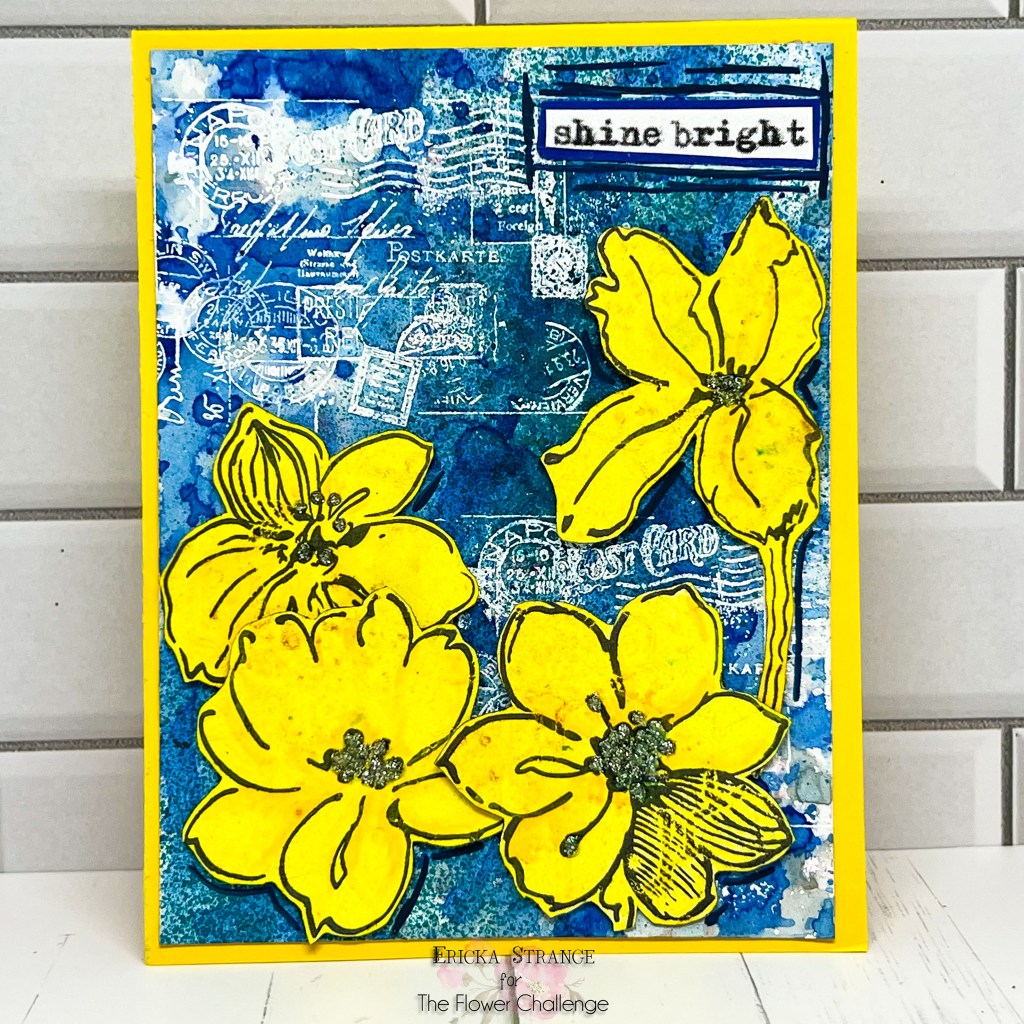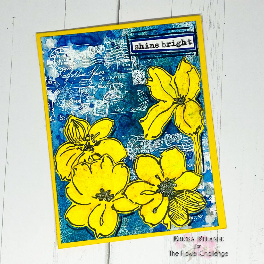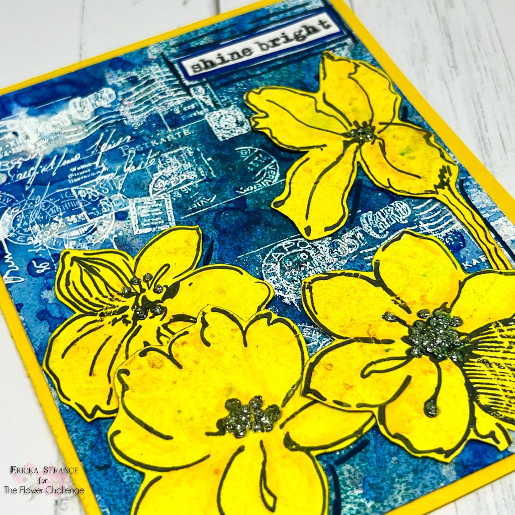 I stamped the Altenew Wild Hibiscus on some yellow paper I had done some ink distress blending. The paper had a little texture paste on it but I like the grungy feel it give my flowers.