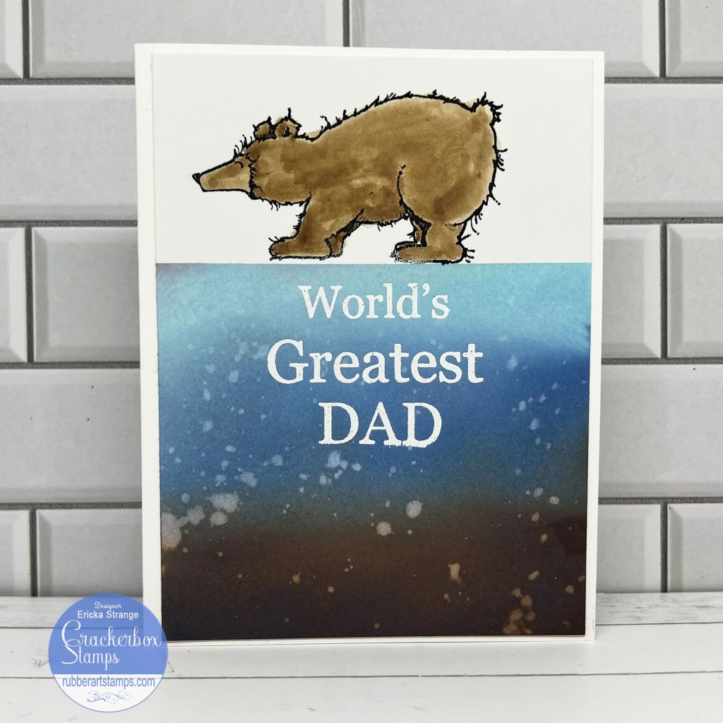 Once my background was dry, I stamped the Bear Fun Orson and watercolored him with the Ground Espresso ink. I then stamped the World’s Greatest and Dad sentiment and white heat embossed it.