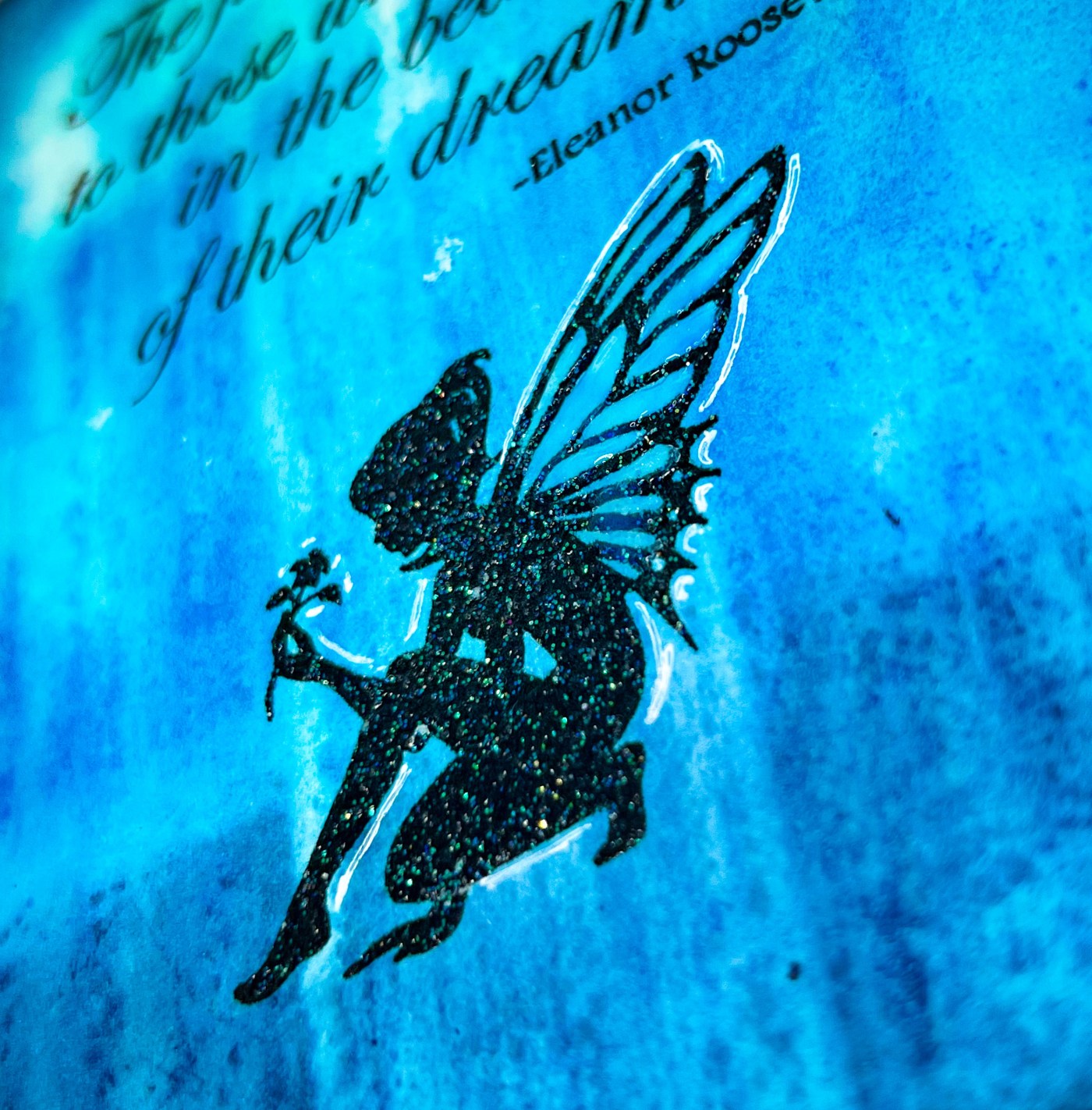 Once my background was dry, I stamped the Fairy With Flower in Versafine Clair Nocturne ink and used some sparkle embossing powder to add some shine. I also stamped the The Future Belongs sentiment and clear heat embossed it.Â